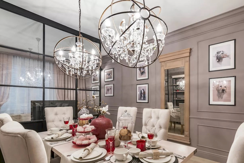 W przypadku zastosowania dwóch żyrandoli nie ma konieczności wybierania tego samego modelu. Mogą różnić się rozmiarem lub wyglądem. Ważne jest, aby produkty były zbliżone stylistycznie. Ta technika stworzy efekt zaskoczenia, dzięki czemu projekt pomieszczenia będzie wyjątkowy. W pomieszczeniu z wysokimi sufitami żyrandole można umieścić na różnych wysokościach.