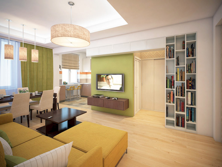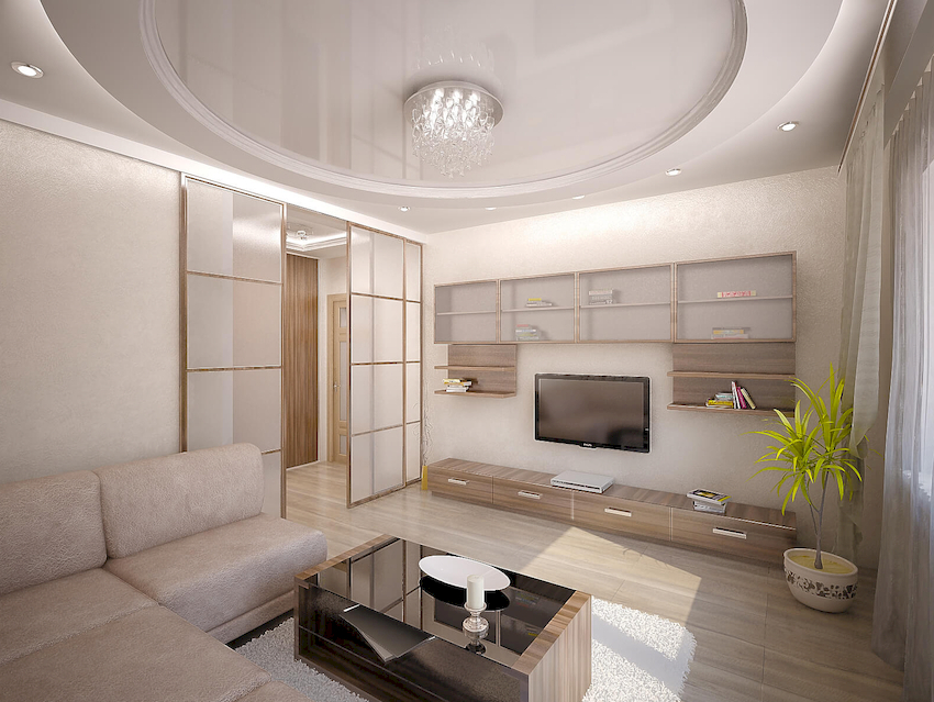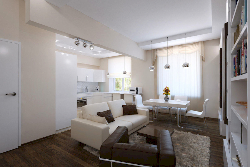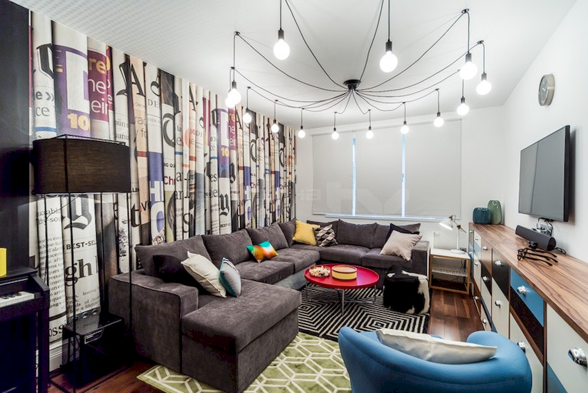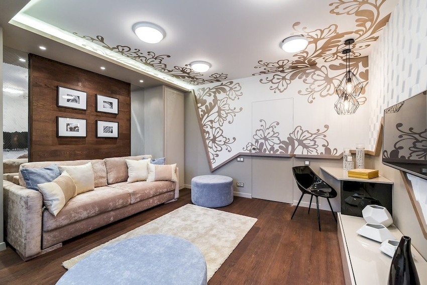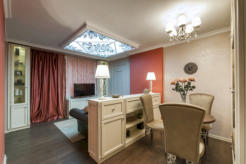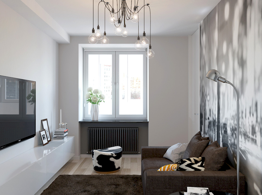 W przypadku małej sali można wybrać te same modele opraw oświetleniowych o różnych kolorach. W tym przypadku żyrandol w jasnym odcieniu jest instalowany bliżej strefy miękkiej, a produkt w ciemnym wzorze przesuwa się na koniec pomieszczenia. Na zdjęciu żyrandoli we wnętrzu salonu pokazano różne opcje lokalizacji.
