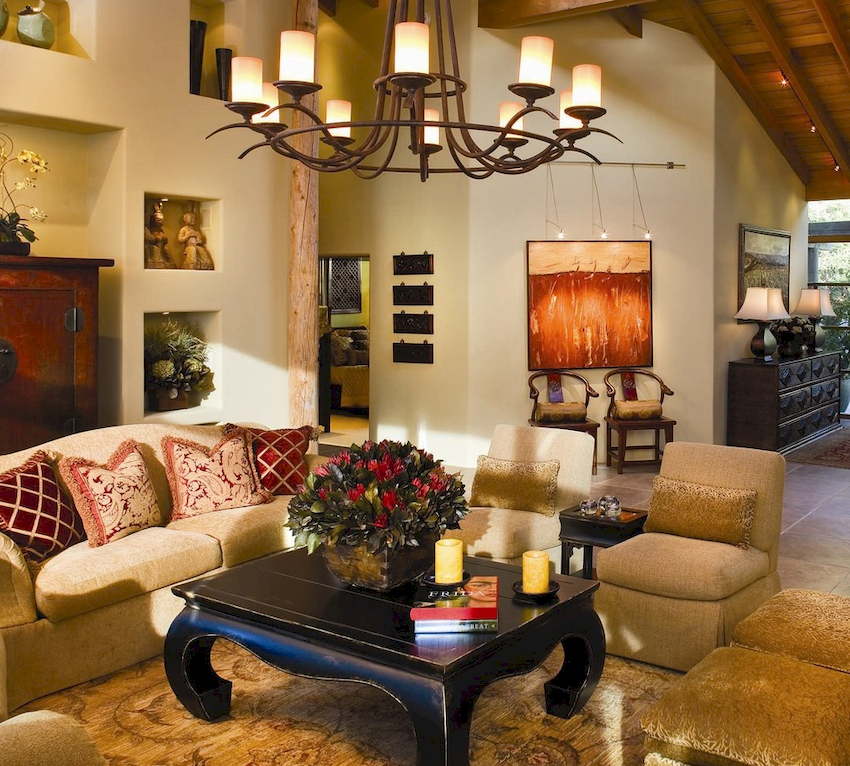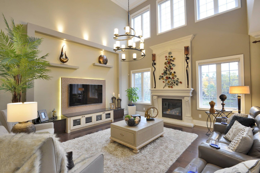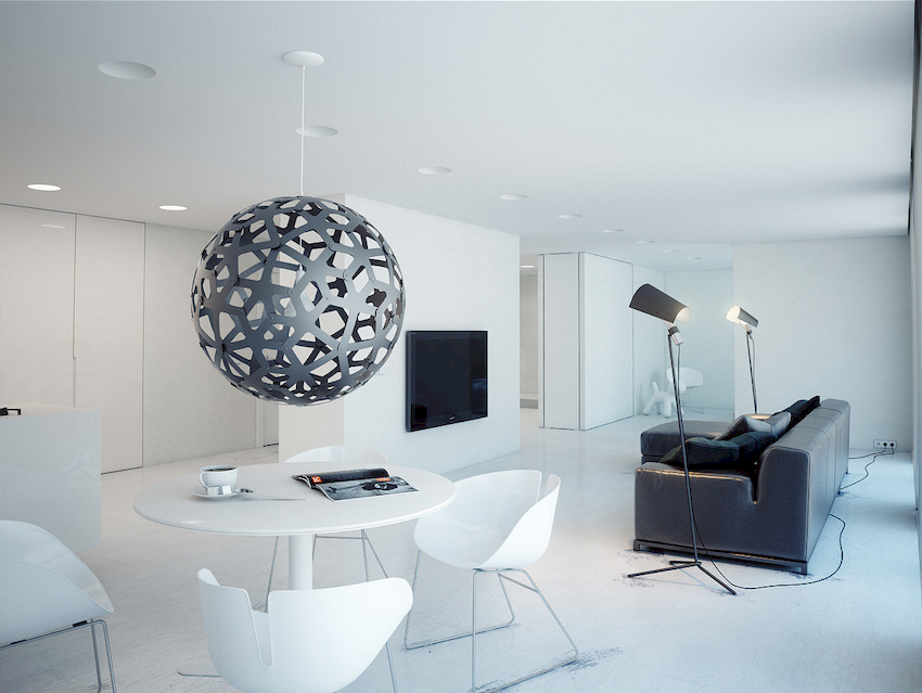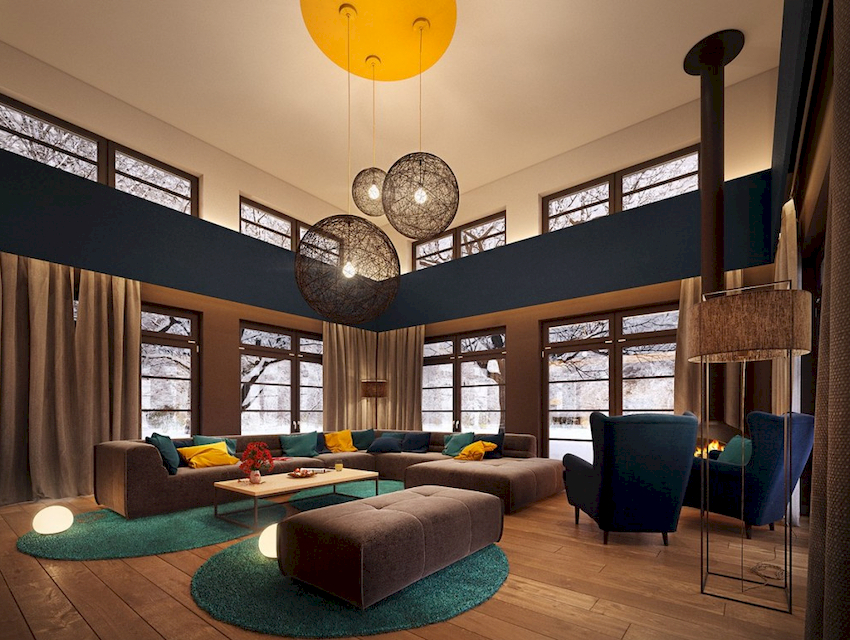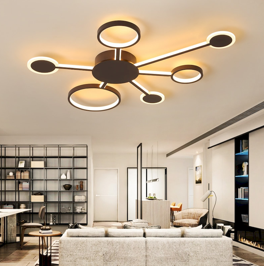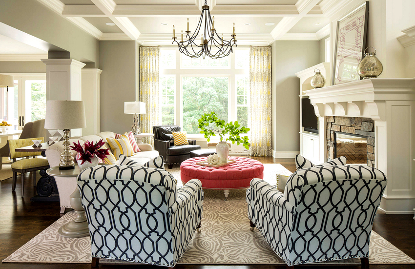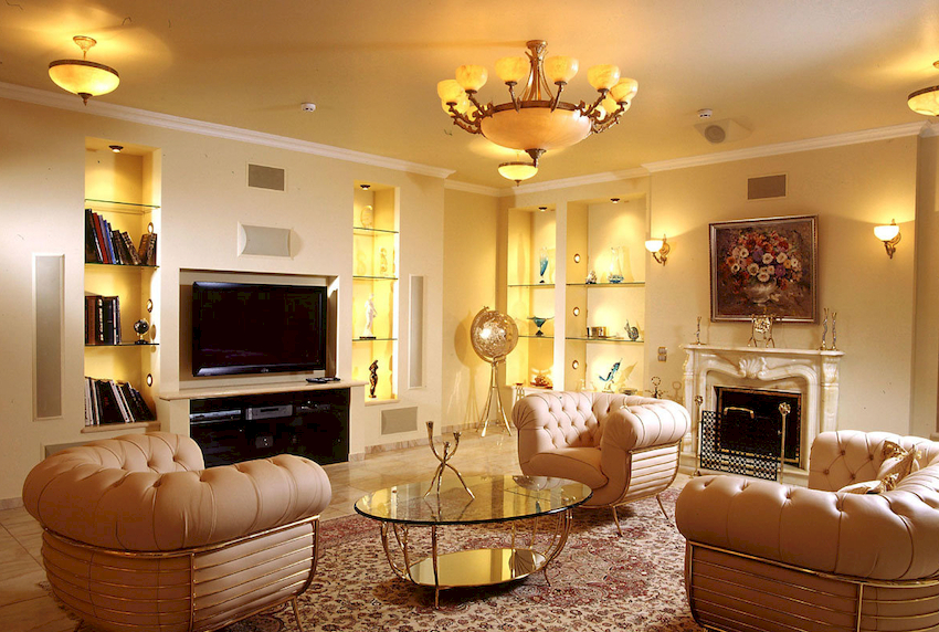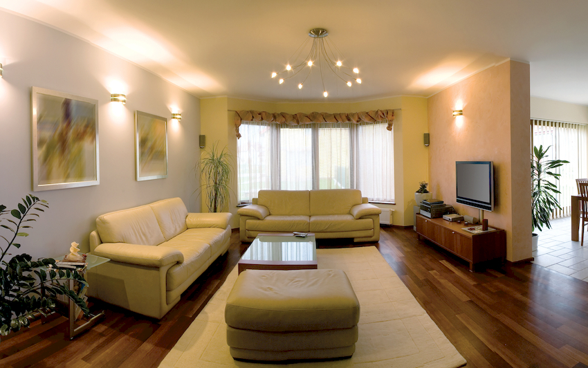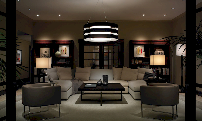 Intensywność i sposób oświetlenia dobiera się w zależności od funkcjonalności stref. Żyrandol sufitowy w salonie nie musi znajdować się na środku pokoju. Może służyć do oświetlania miękkiego obszaru lub miejsca w pobliżu kominka. Umiejscowienie źródła światła zależy od wyposażenia pomieszczenia.