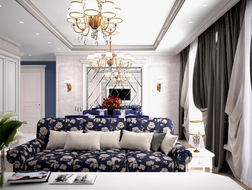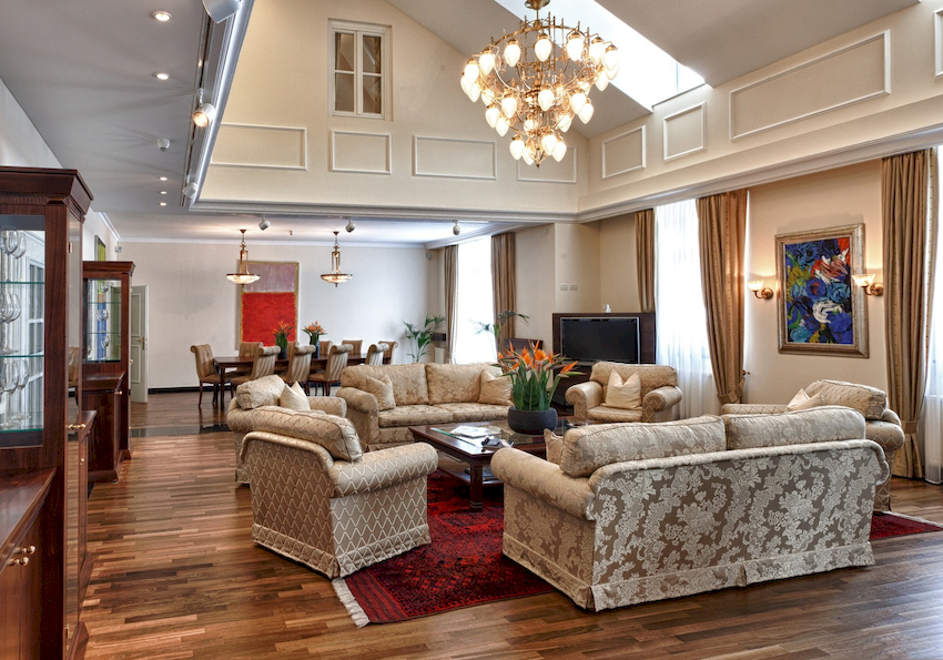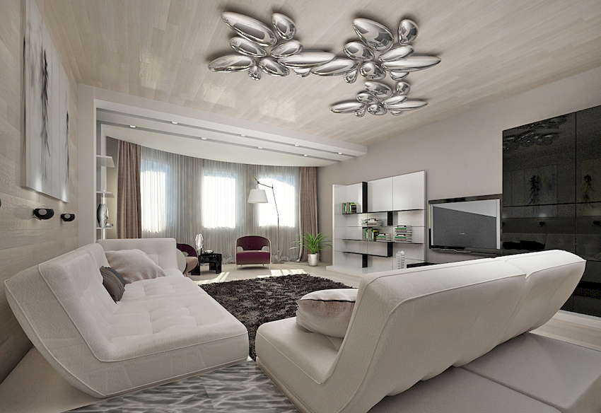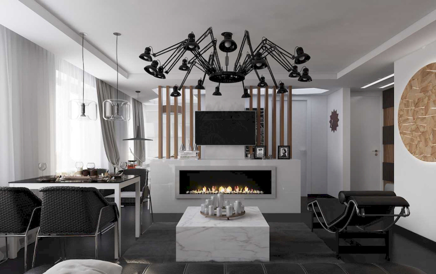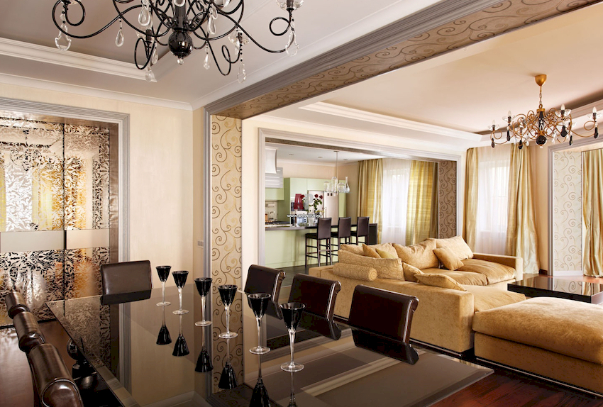 W przestronnych salonach żyrandol można wykorzystać do podziału na strefy. W takim przypadku w każdej strefie możesz umieścić te same opcje produktowe, które nadadzą wnętrzu wykwintnego wyglądu lub połączyć jeden element z innymi źródłami światła w postaci reflektorów lub kinkietów ściennych, które utworzą harmonijny zestaw elementów tego samego stylu.