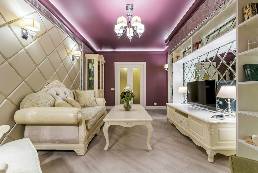 Sufit napinany wykonany jest z folii PVC lub specjalnej tkaniny naciągniętej na profil. To wykończenie jest szczególnie wrażliwe na podwyższone temperatury. Może się odkształcać, tracąc elastyczność, gdy powierzchnia zostanie podgrzana o więcej niż 60 ° C. Ta cecha wpływa na wybór modelu żyrandola do przedpokoju.