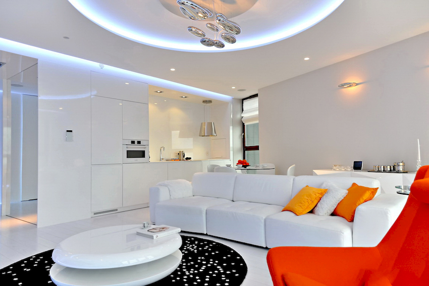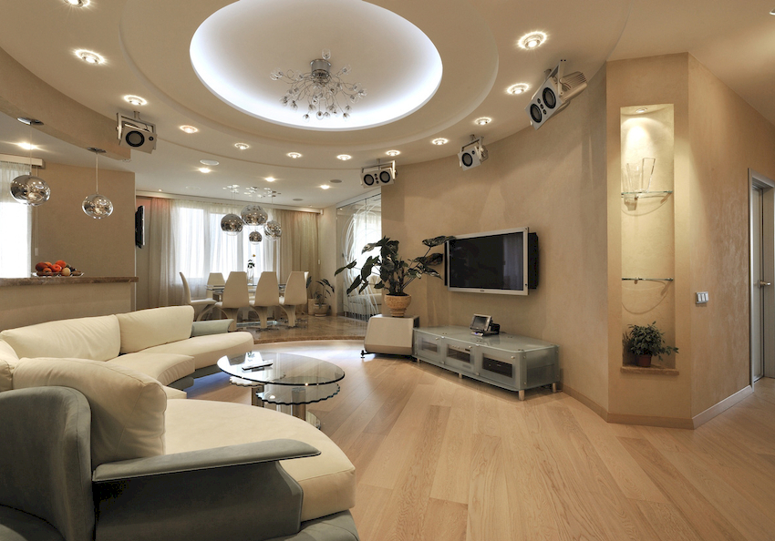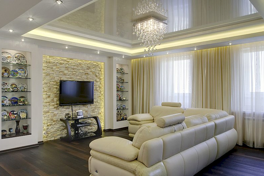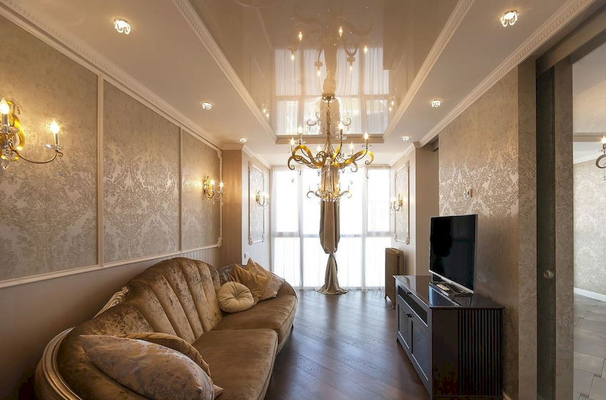 Przydatna rada! Do salonu z sufitem napinanym lepiej wybrać żyrandole z dużą liczbą słabych żarówek niż produkty z mocnymi, niewielkimi elementami oświetleniowymi.