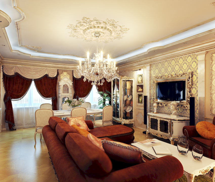 Styl barokowy preferuje wielkość i królewskość we wszystkich detalach wnętrza. W takim pomieszczeniu należałoby wyglądać jak piękny kryształowy żyrandol w salonie z ramą z kutego żelaza, uzupełniony różnorodnymi ozdobnymi wisiorkami, które blaskiem oświetlają pomieszczenie. Mile widziana jest obfitość kwiecistych i koronkowych linii.
