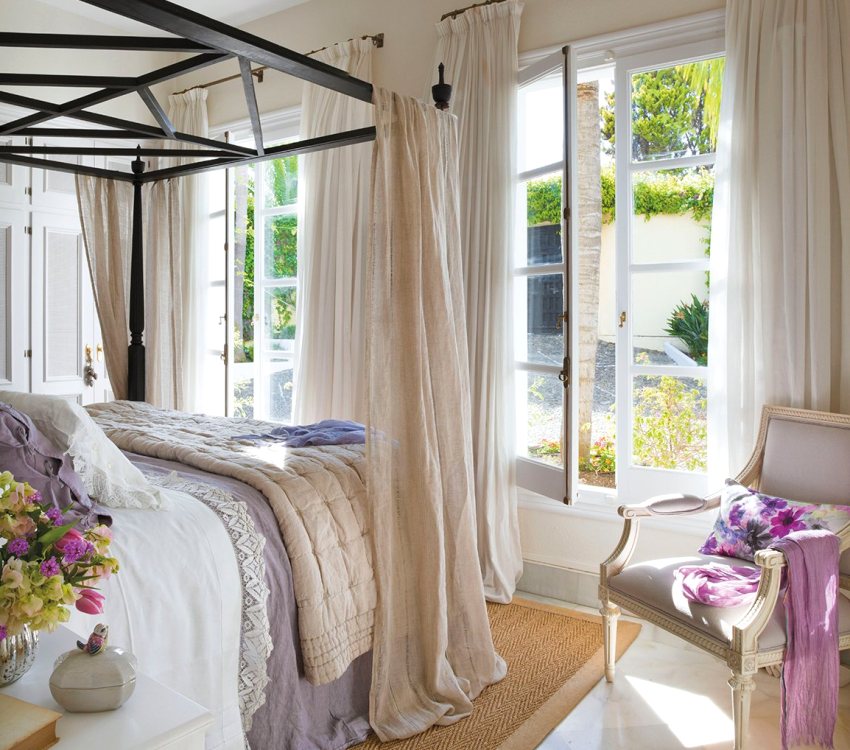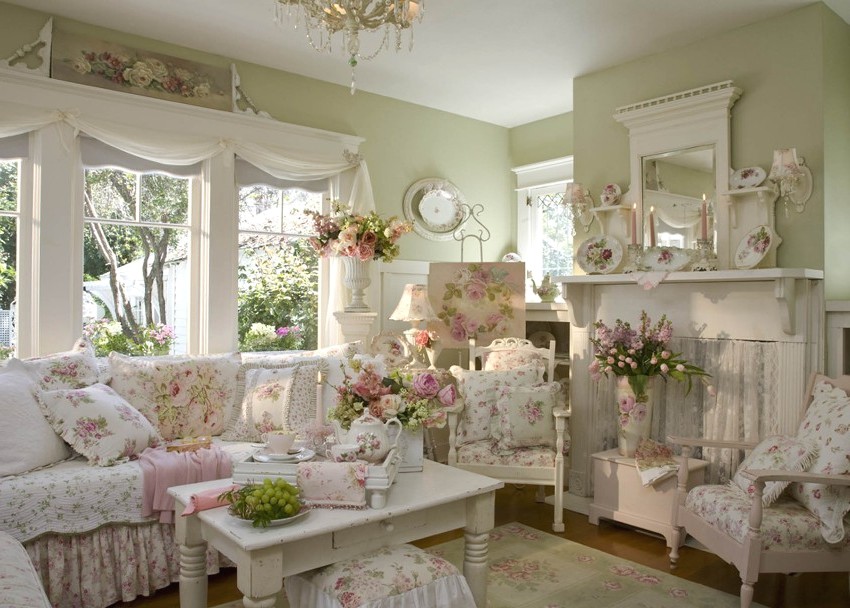 - tekstylia są reprezentowane przez naturalne tkaniny ze wzorem w postaci szkockiej klatki, pasków lub gładkich tkanin z drobnymi motywami roślinnymi;