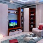 Meble narożne charakteryzują się przestronnością: książki, urządzenia, elementy wystroju są kompaktowo umieszczone w takiej ścianie. Modułowy system telewizyjny w zależności od potrzeb może być wyposażony w inne niezbędne sekcje. W zależności od wymiarów pomieszczenia ścianę można uzupełnić półkami lub zastosować piękne przeszklenia.