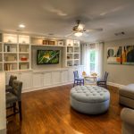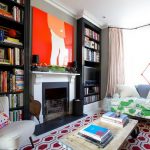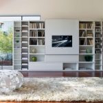 Jeśli mówimy o aranżacji dużego salonu, to zaleca się zastosowanie modułowych regałów narożnych, które oprócz funkcji głównej pomagają strefować przestrzeń. Do oddzielenia jadalni od salonu można wykorzystać otwarte półki. Zaleca się uzupełnienie kącika do siedzenia o wbudowany fotel lub małą sofę, którą można w razie potrzeby wysunąć lub złożyć.