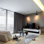 - Wysoka technologia. Na zdjęciu zasłon w salonie w nowoczesnym stylu bardziej powszechne są srebrne płótna achromatyczne. Zaletą będzie obecność panelu sterowania, za pomocą którego można regulować położenie zasłon.