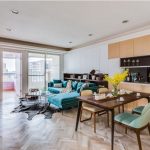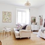 Paletę kolorystyczną kawalerki można urozmaicić, przyciągając do tkanin i tapicerki meblowej pastelowe kolory z wyrazistym wzorem. Aby dodać odrobinę szlachetności, pomoże użycie imitacji drewna do podłóg.