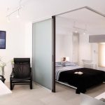 Przesuwane szklane drzwi mogą służyć do osłonięcia sypialni w pobliżu okna. Uwagę zwracają zdjęcia wnętrz mieszkań w tym projekcie. Pozwala to chronić sypialnię przed zapachami, dźwiękami, ale nie koliduje z przenikaniem naturalnego światła do części dziennej. Część sypialna powinna znajdować się po drugiej stronie od wejścia i łazienki.Aby przechowywać w pokoju wszelkiego rodzaju rzeczy i meble, warto postawić szafę, w której można wyjąć składany stół, składane krzesła lub schować za nią.