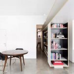 Możesz wyznaczyć przestrzeń życiową za pomocą kompaktowych regałów zainstalowanych w całym pomieszczeniu. Niskie meble dobrze wyznaczają granice stref bez przeciążania przestrzeni. W takich stojakach wygodnie jest przechowywać naczynia i inne przedmioty. Możesz również podzielić kuchnię i salon podobnym meblem.