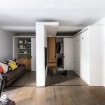 Ciekawym rozwiązaniem jest łóżko składane, które chowa się w korpusie szafy za drzwiami, przekształcając niedawne łóżko w część dzienną. Jej drzwi mogą pełnić rolę sekretarki i jednym ruchem stworzyć miejsce pracy. Zdjęcie układu i wnętrza kawalerki o powierzchni 18 mkw. jasno to pokazują.