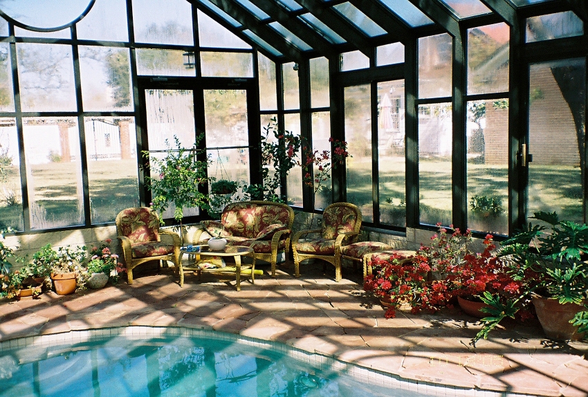 Ogród zimowy z basenem nie wymaga dodatkowego nawilżania. Zbiornik z wewnętrzną cyrkulacją i połączonym systemem drenażu zapewni niezbędny obieg wody w szklarni.