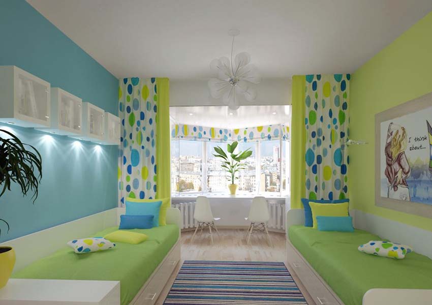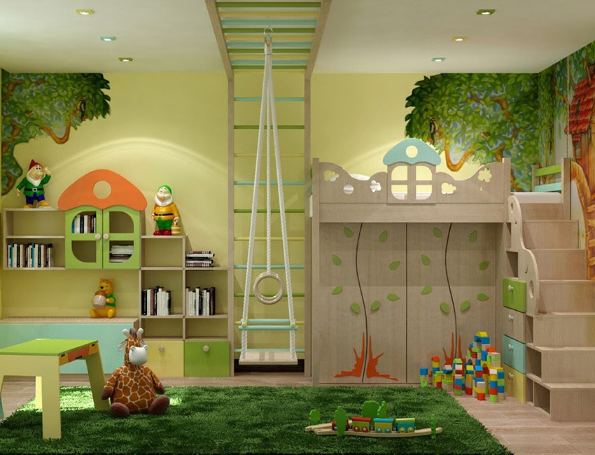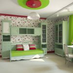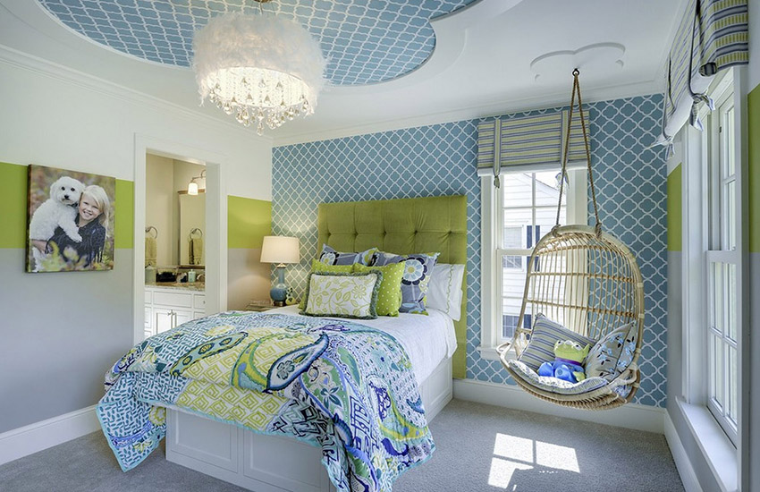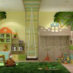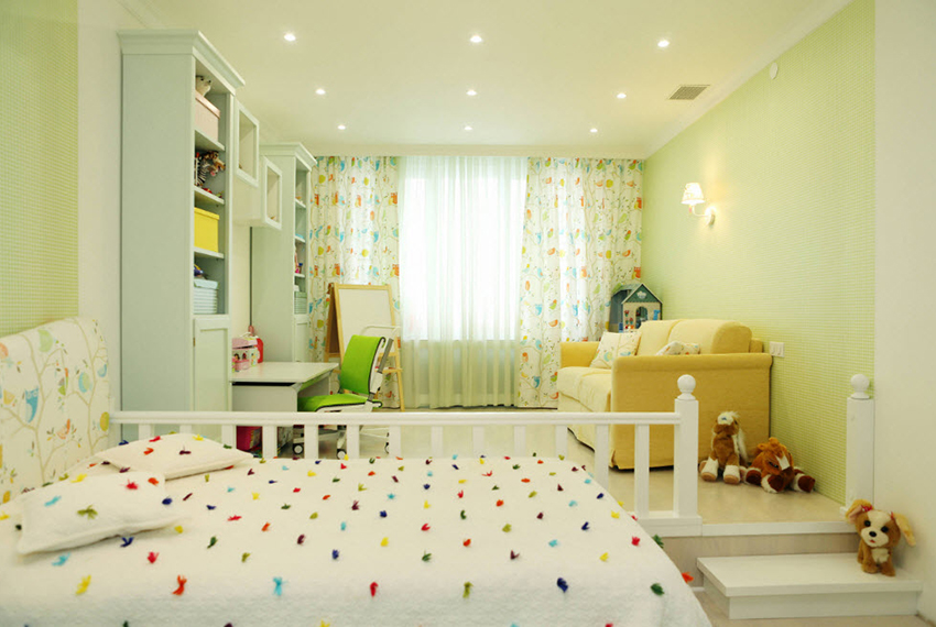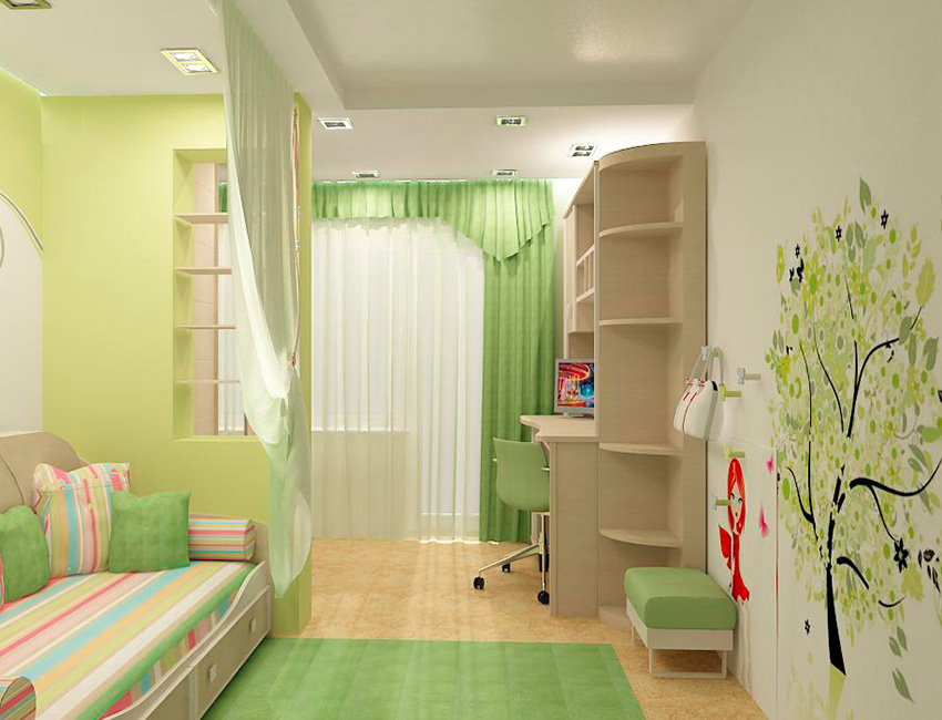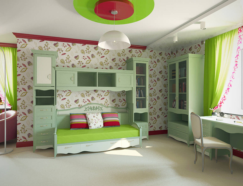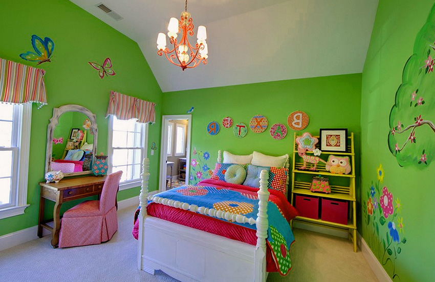 Często zieleń służy do dekoracji wnętrza pokoju dziecięcego w szerokiej gamie odcieni.