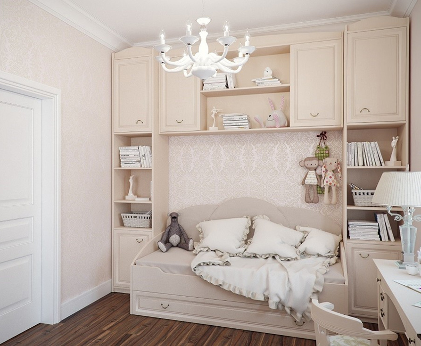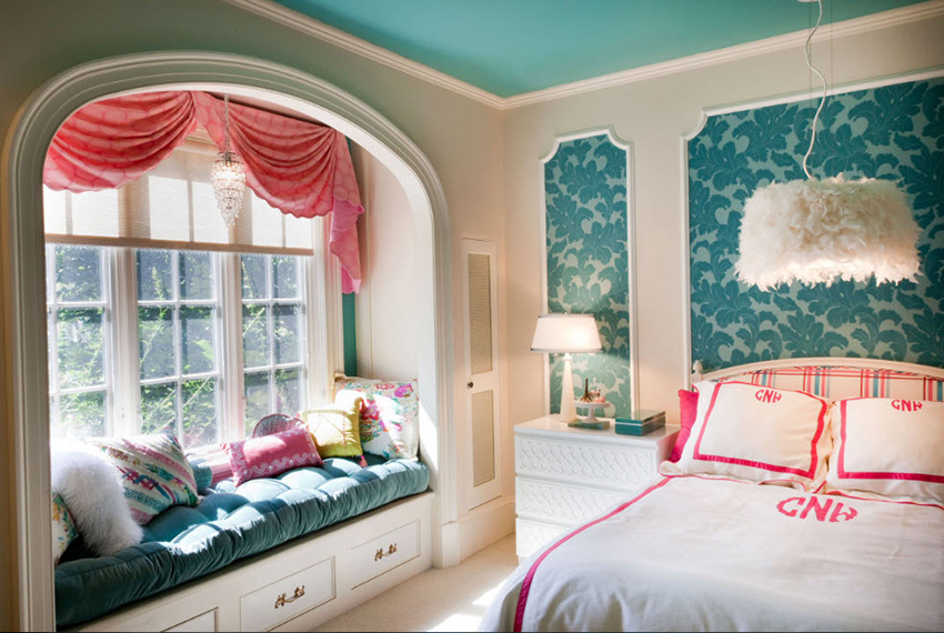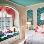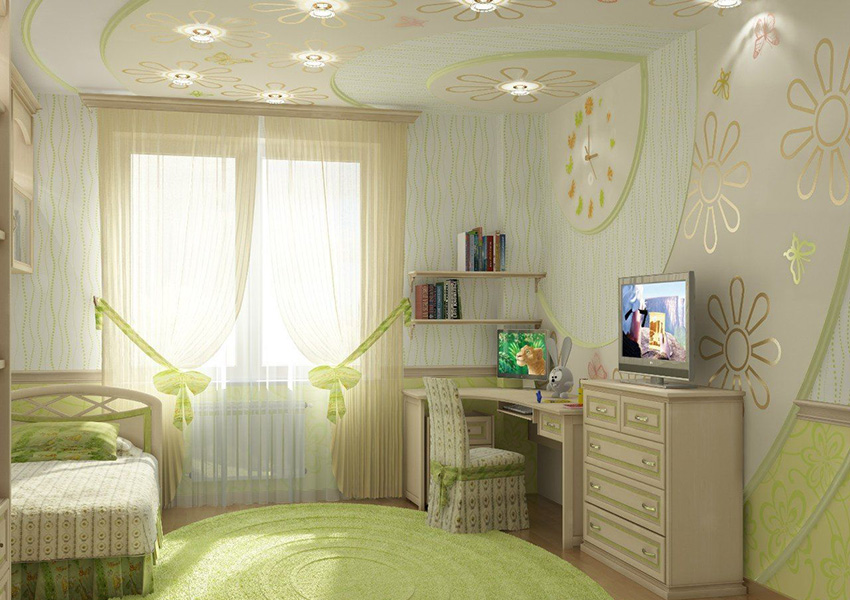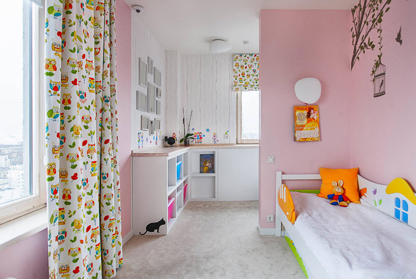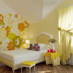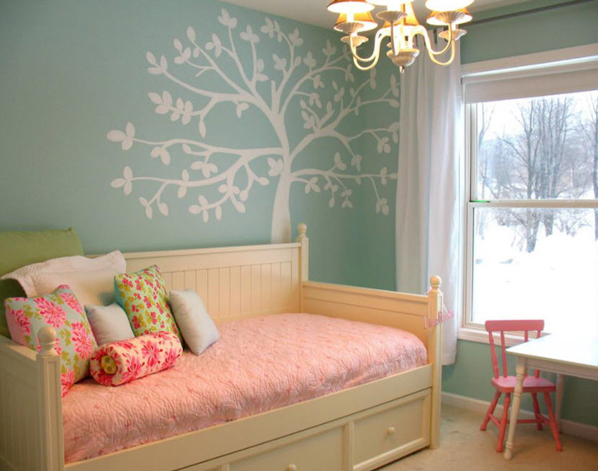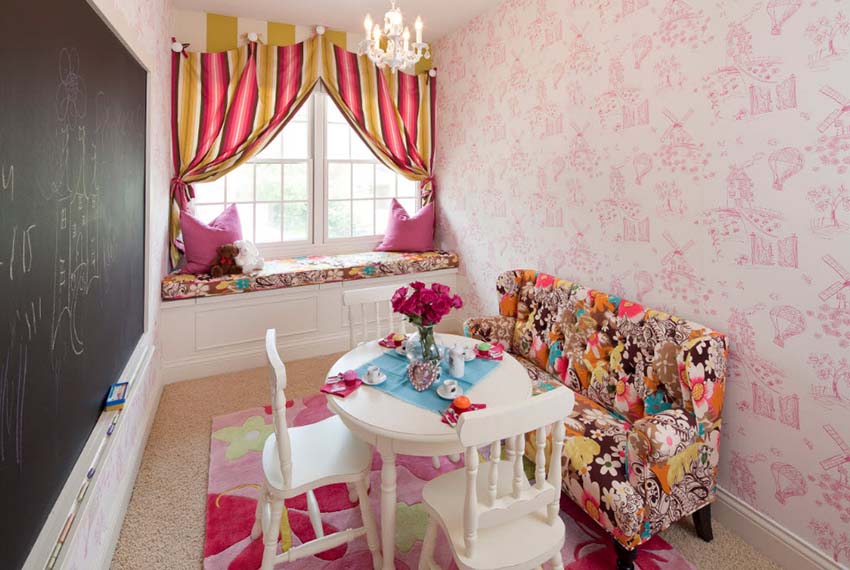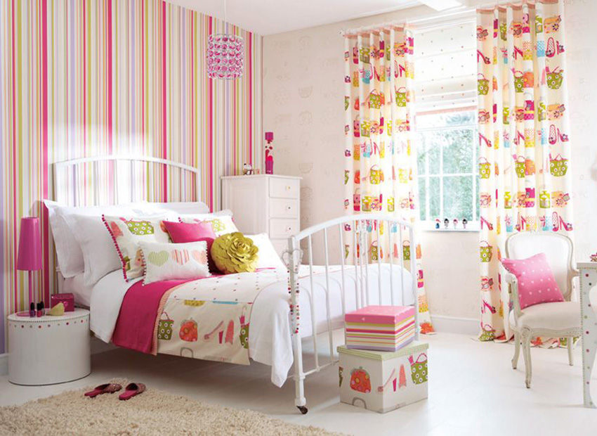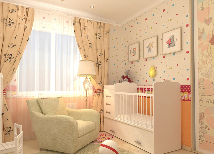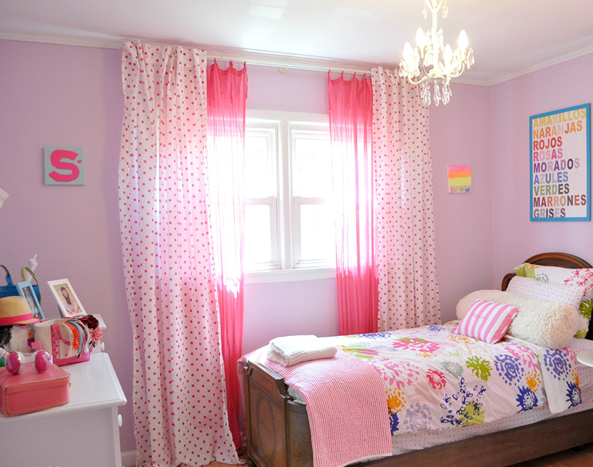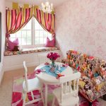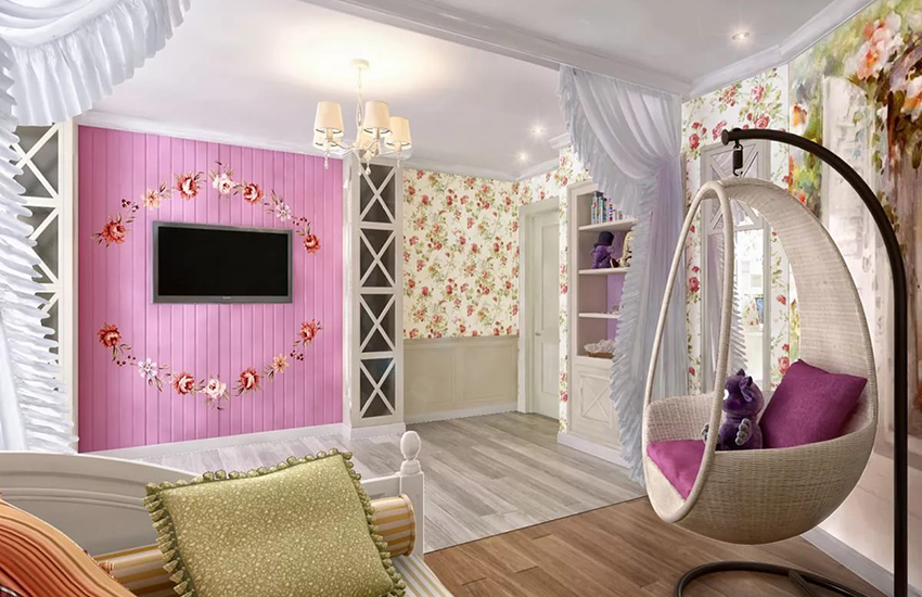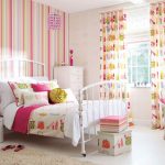 Jako główny schemat kolorów lepiej jest preferować pastelowe lub miękkie odcienie ciepłej palety. Jeśli wzór na zasłony a poduszki nie są zbyt jasne, można kupić tapety dla dziewczynek o podobnym wzorze.