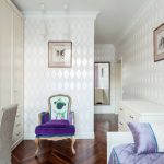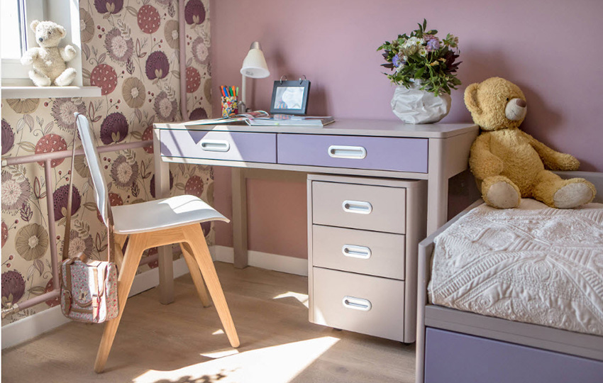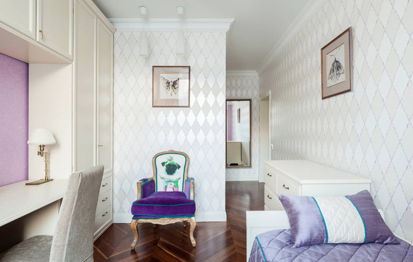 Jeśli zastosujesz liliową tapetę w połączeniu z beżowymi i mlecznymi tonami, możesz uzyskać emocjonalnie zrównoważone wnętrze. Ponadto w samej dekoracji nie muszą występować tony pomocnicze. Mogą być częścią tekstyliów lub mebli. Dzięki temu kontrastowi w pokoju dziecięcym ukształtuje się pozytywny nastrój.