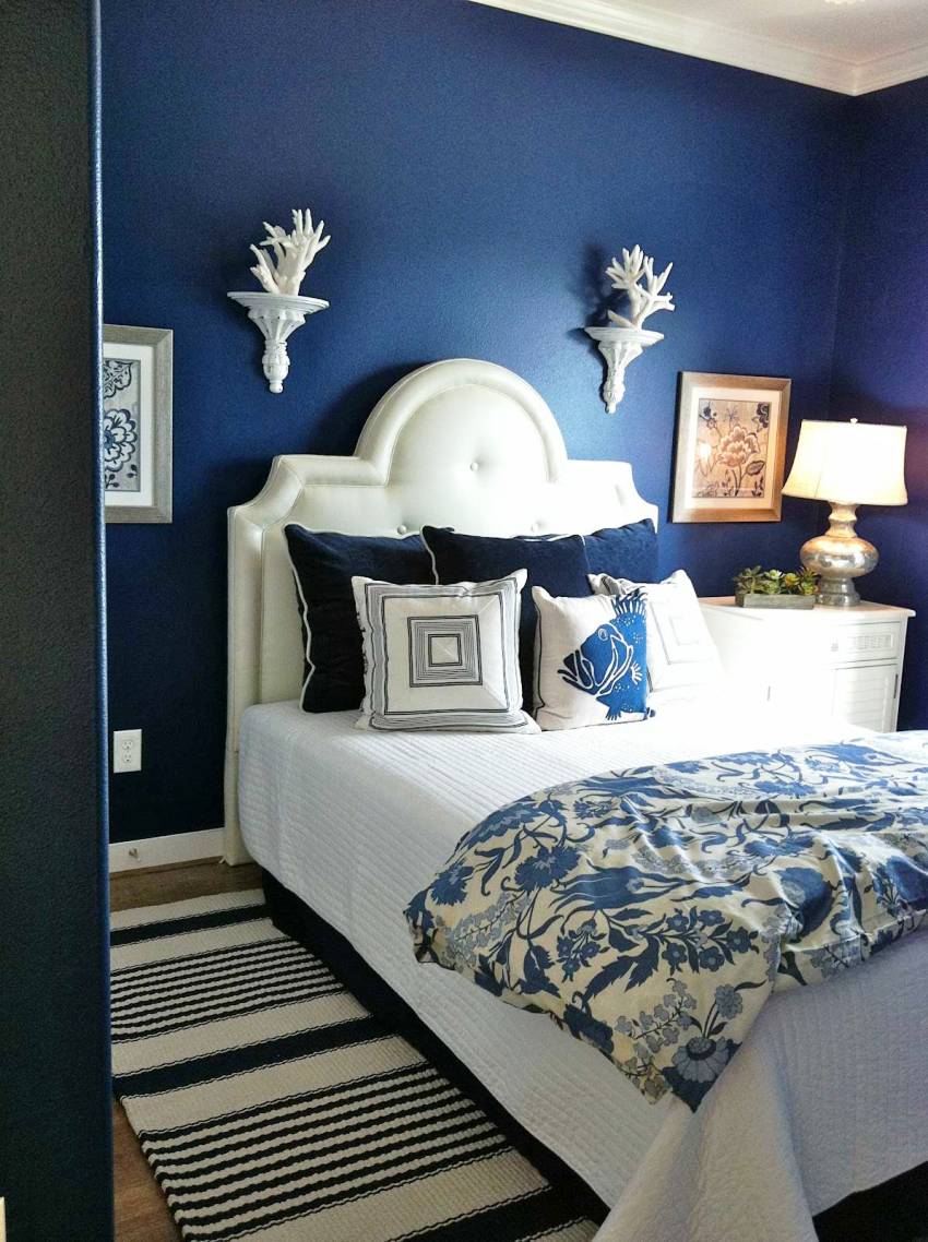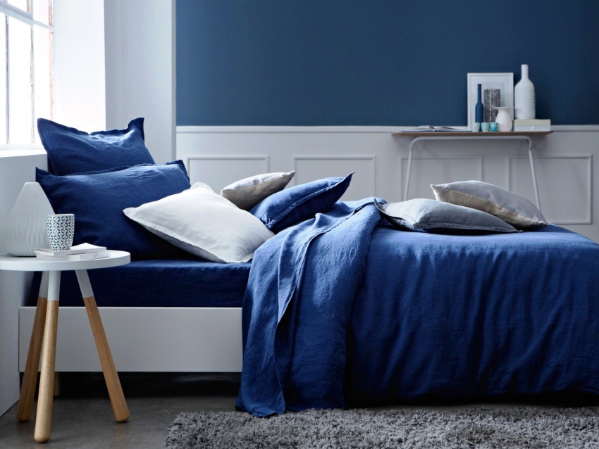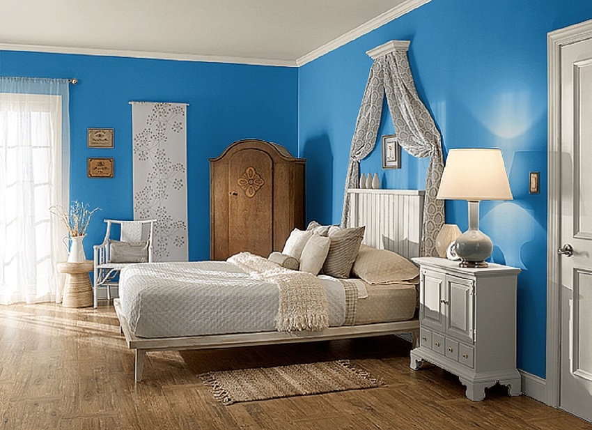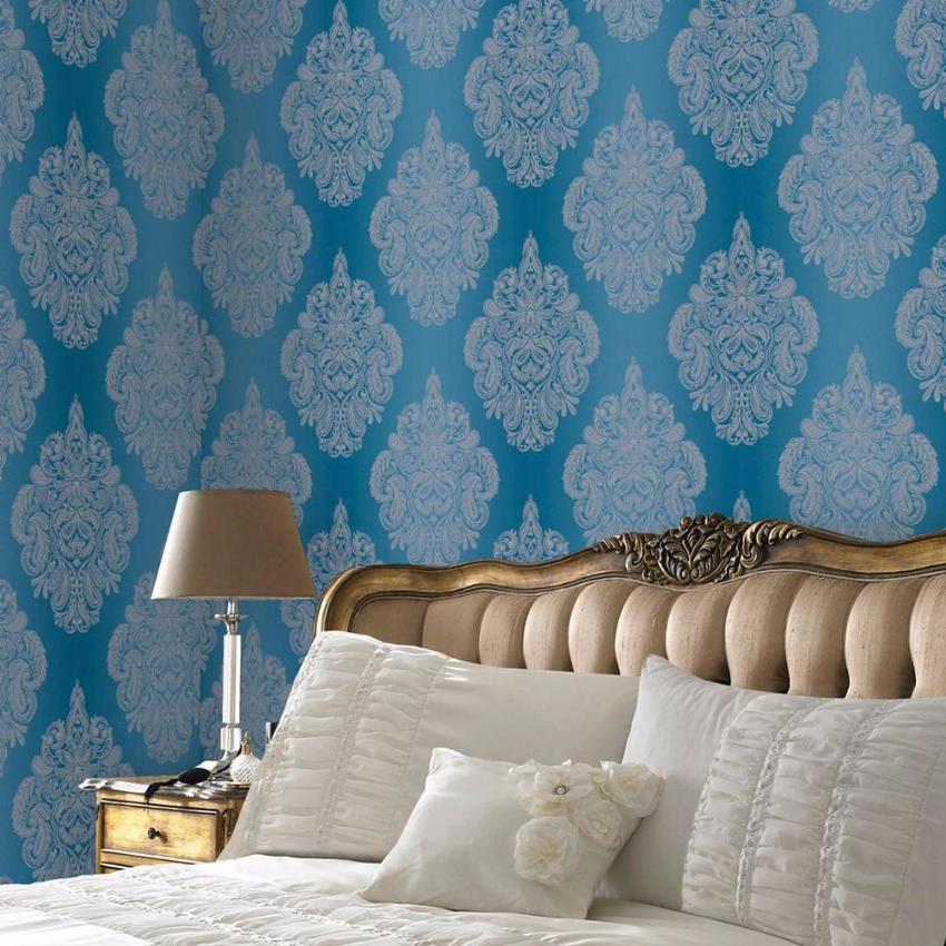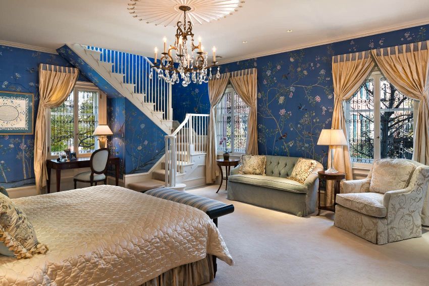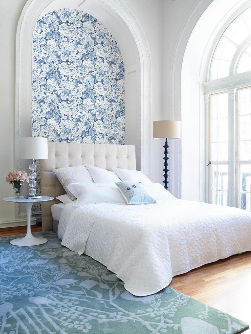 Klasyczne wnętrze sypialni można stworzyć za pomocą tapety w kolorze szafiru lub indygo z dużym ciemnym lub złotym wzorem. Dla tych, którzy preferują styl prowansalski, odpowiednie są jasnoniebieskie wykończenia, uzupełnione białymi antycznymi meblami z patyną, jasnym sufitem i przewiewnymi przezroczystymi zasłonami. Pokrycia z kwiatowym nadrukiem na ścianie za łóżkiem wyglądają oryginalnie, wnosząc do pomieszczenia świeżość i naturalną esencję.