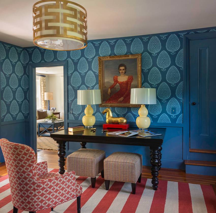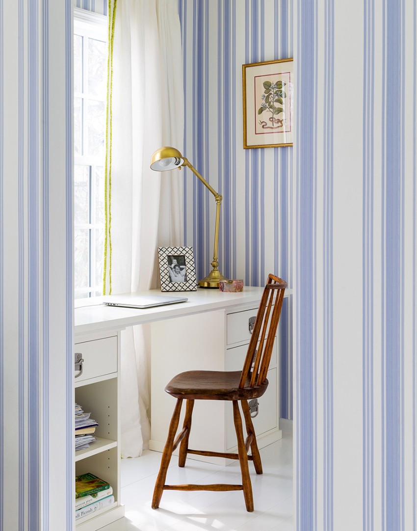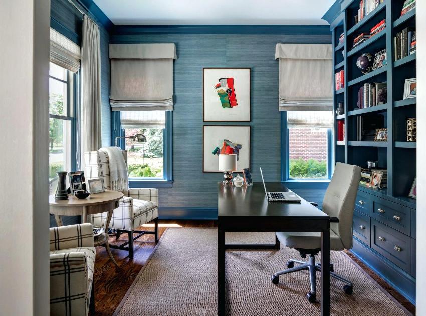 Pomieszczenie z niebieską tapetą w połączeniu z białą tapetą działa kojąco, łagodzi zmęczenie po całym dniu pracy