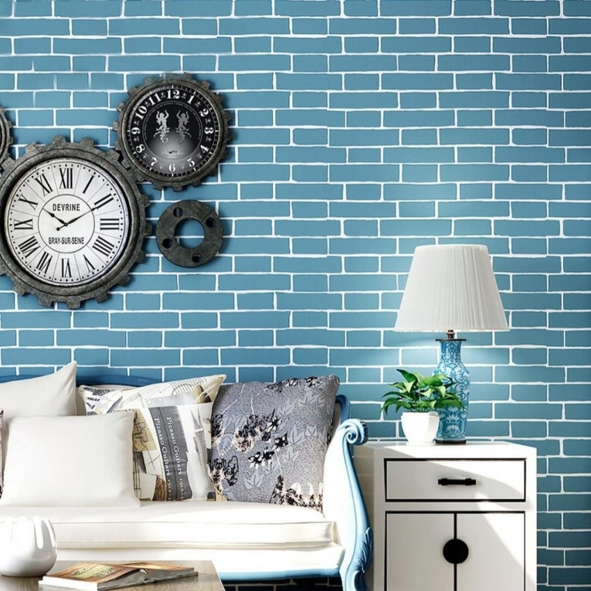 Ozdobą pokoju jest tapeta w paski. Połączenie niebieskiego i białego daje oszałamiający efekt, który przyczynia się do wizualnego dopasowania wymiarów pomieszczenia. Poziome pasy poszerzają jego wymiary, natomiast pionowe pasy zwiększają wysokość pomieszczenia. Wnętrze odświeży niebiesko-biała klatka. Ta opcja będzie prawdziwym dobrodziejstwem dla projektu pokoju dziecięcego i sypialni.Niebieska tapeta we wnętrzu, imitująca naturalne materiały, prezentuje się stylowo i nowocześnie. Takie wykończenie drewnem lub cegłą wnosi do pomieszczenia ciepło i komfort.