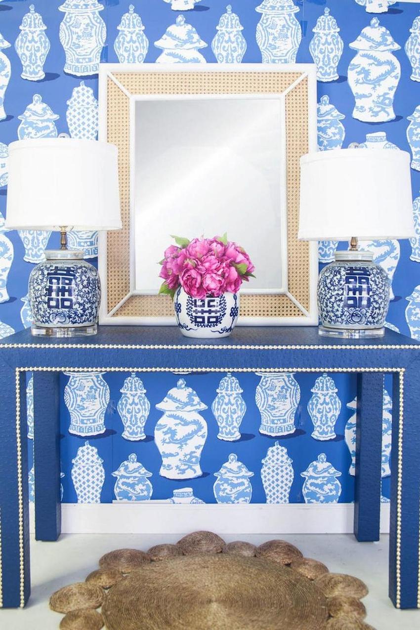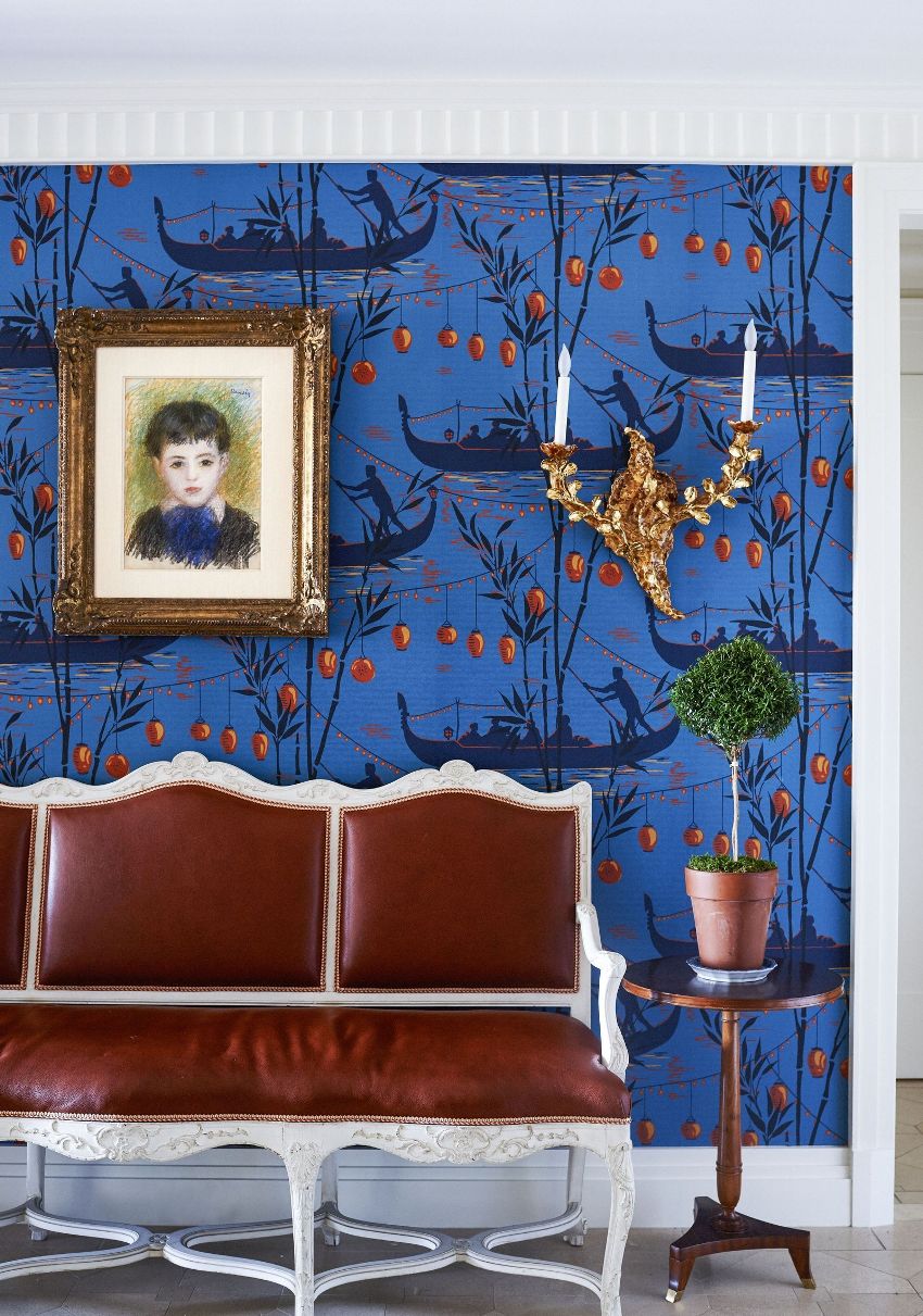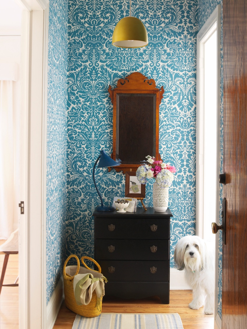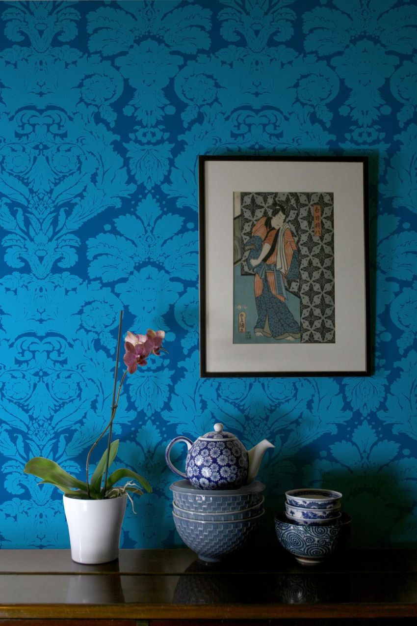 Istnieje wiele odmian okładzin ściennych z niebieskim wzorem. Zdjęcie pięknej tapety jest tego wyraźnym potwierdzeniem. W przypadku produktów z ornamentem wzór należy powtórzyć w pozostałych elementach wnętrza, co wpływa na harmonijną atmosferę w pomieszczeniu.