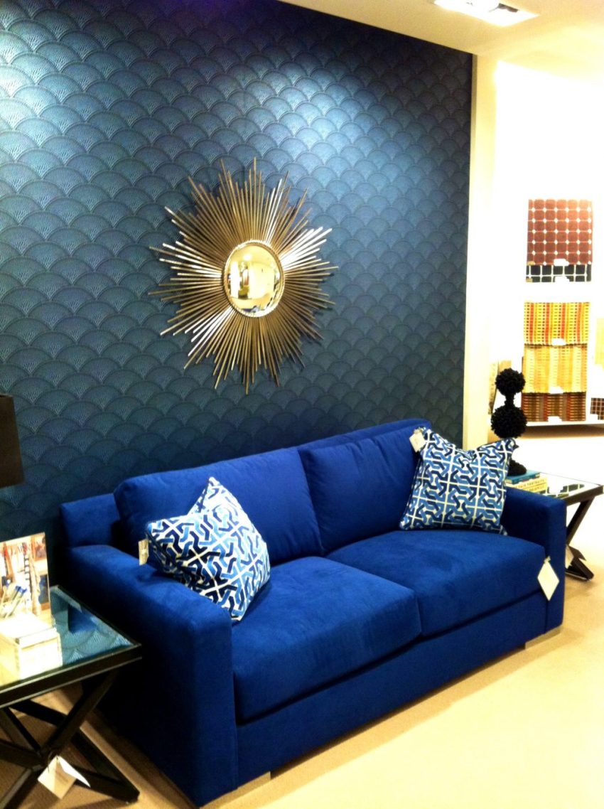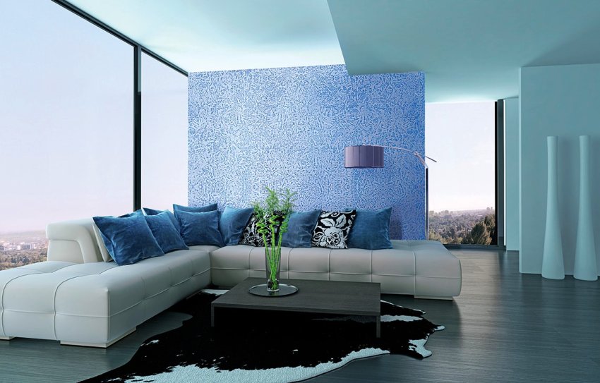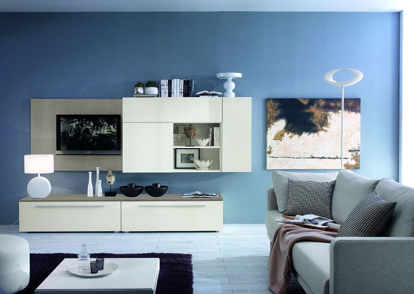 Niebieskie wykończenie to idealne rozwiązanie do przestronnego, jasnego salonu wychodzącego na południe. Ten kolor najlepiej pasuje do nowoczesnych trendów. Dodając odrobinę złocenia niebieska lamówka dobrze komponuje się z neoklasycyzmem. Podczas dekorowania pokoju najczęściej stosuje się opcję wklejania ściany za sofą zwykłymi niebieskimi produktami. Aby to zrobić, użyj bogatych odcieni kobaltu, szafiru i bławatka, tapety indygo. Dopełnieniem takiej powierzchni jest lekkie wykończenie pozostałych ścian, co pozwala na wypełnienie pomieszczenia powietrzem.