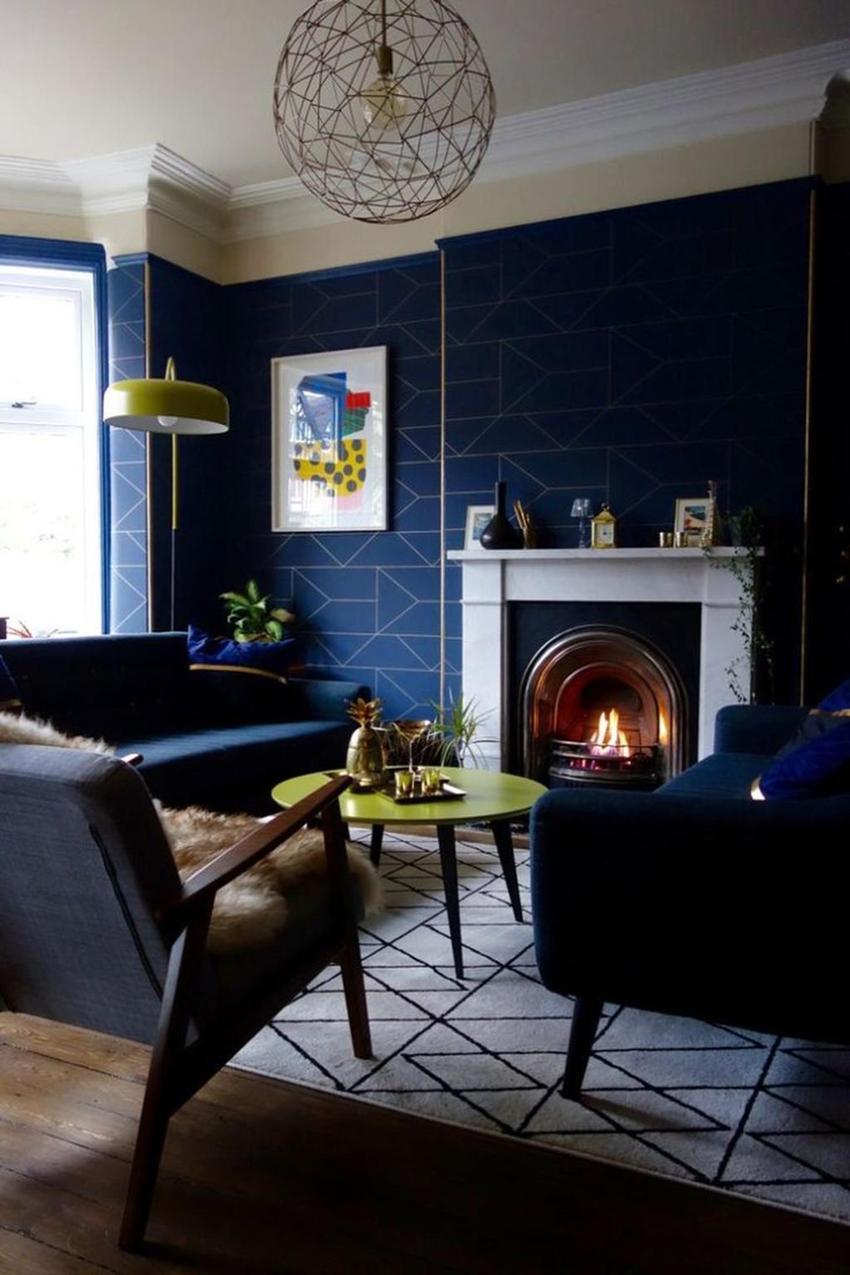 Nadmierne użycie niebieskiej tapety w pomieszczeniu może stworzyć ponure i niewygodne otoczenie. Dlatego najpopularniejszą opcją jest zaprojektowanie ściany akcentującej w tej palecie, która może być wykonana w jednokolorowym wyrazistym wzorze lub ozdobiona oryginalnym wzorem, który powtarza się w innych detalach wnętrza. Ta technika natychmiast wskazuje centralne miejsce w pomieszczeniu, przyciągając do niego wzrok.