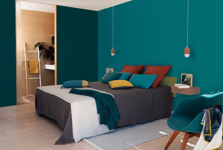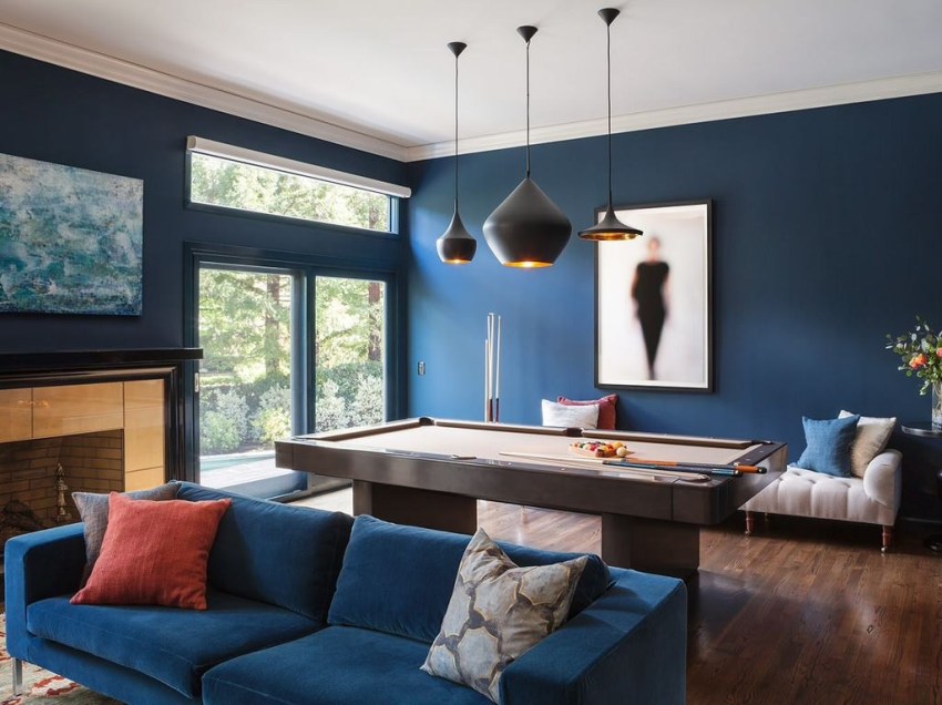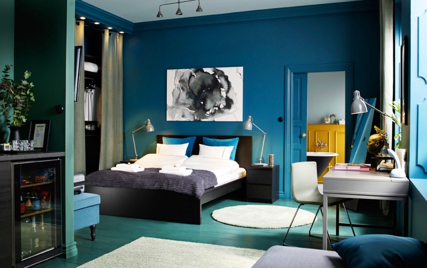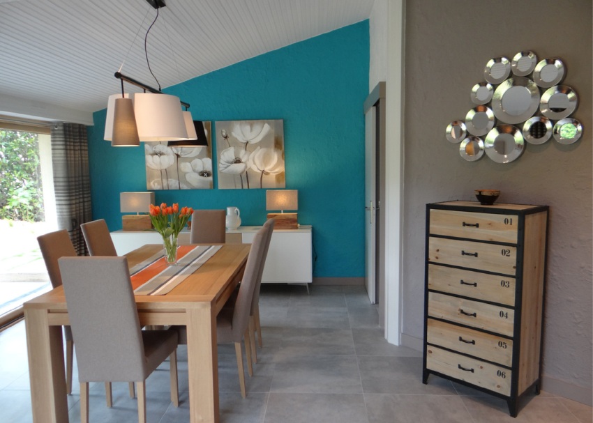 Najbardziej odpowiednią opcją w przypadku zastosowania monochromatycznej powłoki jest połączenie jej ze spokojniejszymi odcieniami, które znajdują się na sąsiednich ścianach, przyciągając uwagę. Detale tego samego koloru lub kontrastujące elementy wyglądają odpowiednio w prostym niebieskim pomieszczeniu.