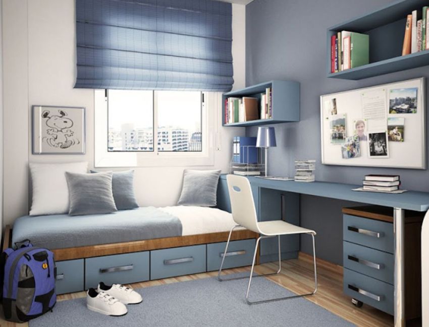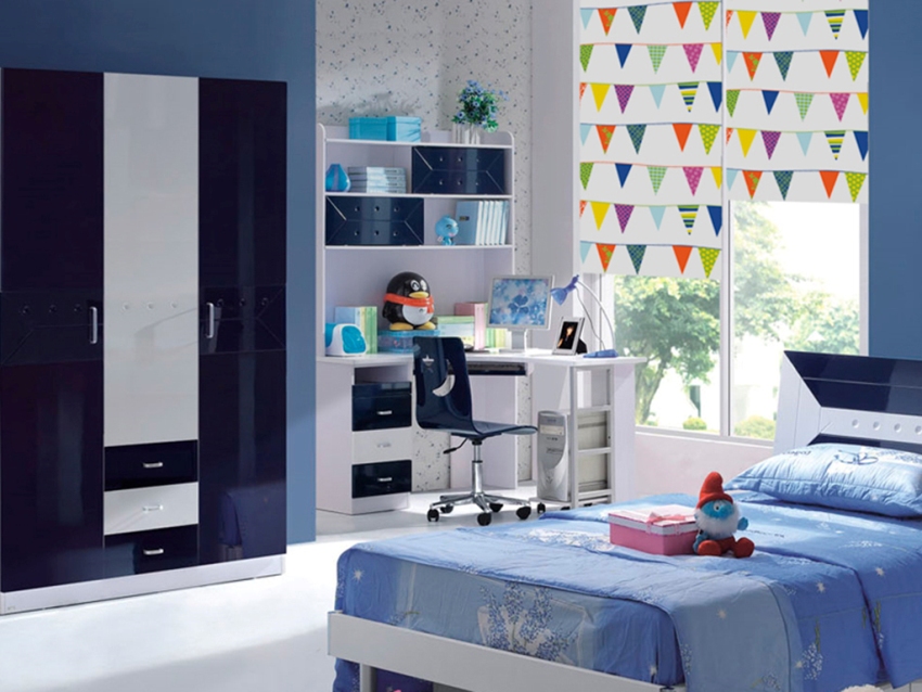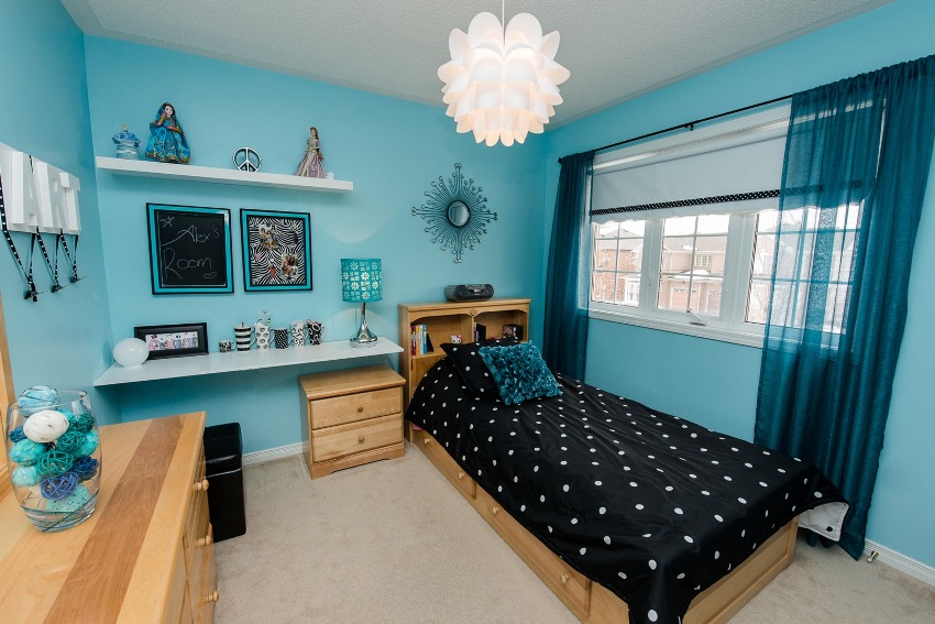 Taka paleta ułatwia przebrnięcie przez trudny okres dorastania w okresie przejściowym, przyczynia się do procesu myślowego i sukcesu akademickiego. Idealna do dziecięcej sypialni w odcieniach błękitu, dopełnienie kolorystyczne w postaci bieli, beżu i złota. Tematyczne tapety na jednej ze ścian prezentują się w takim pomieszczeniu oryginalnie, inne natomiast utrzymane są w niebiesko-niebieskim odcieniu.