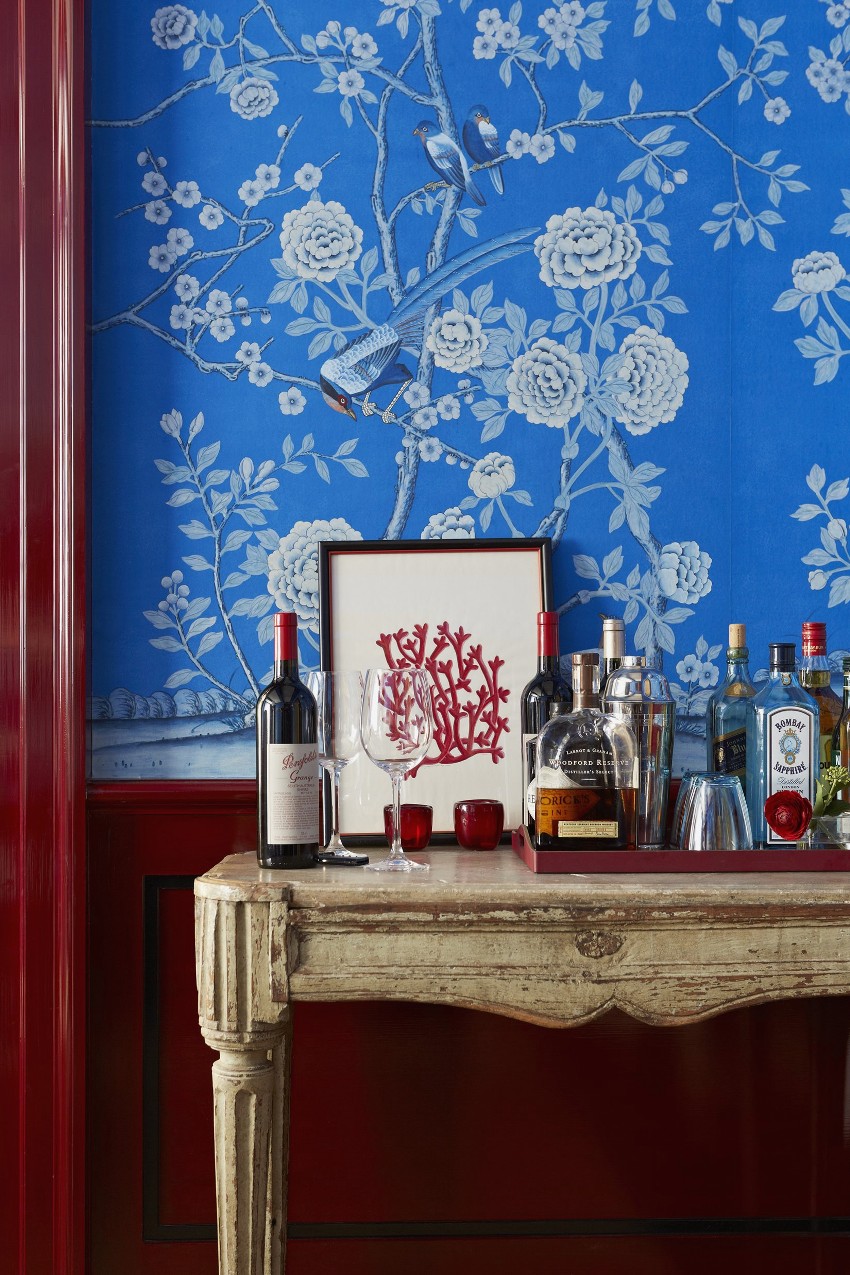 Połączenie niebieskich i czerwonych tapet we wnętrzu wygląda oryginalnie i wyraziście. W tak kontrastowym wnętrzu zbiegają się dwa przeciwieństwa: przedstawiciele zimnej i ciepłej palety kolorów. Jednak taki tandem wymaga starannego połączenia, aby nie powodować nierównowagi we wnętrzu. Kolor niebieski jest głównym kolorem, podczas gdy czerwony może być używany w obszarach akcentujących lub pojedynczych motywów.
