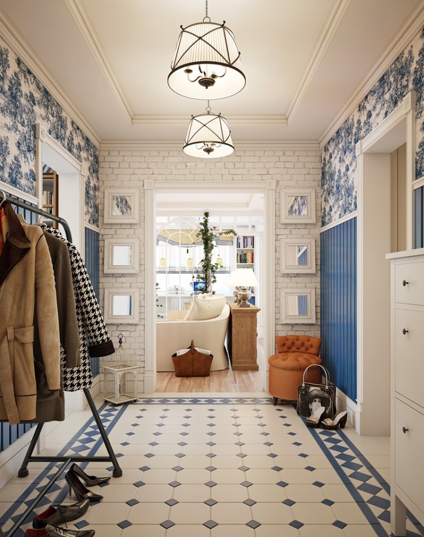 Niepożądane jest używanie koloru niebieskiego podczas dekorowania korytarza. Pomieszczenie jest zwykle małe i brakuje w nim naturalnego światła. Ciemne wykończenia mogą dodatkowo zmniejszyć rozmiar korytarza, sprawiając, że atmosfera jest ściśnięta i ponura. Jednak w obecności jasnego i mocnego sztucznego oświetlenia pomieszczenie można ozdobić niebieską paletą.