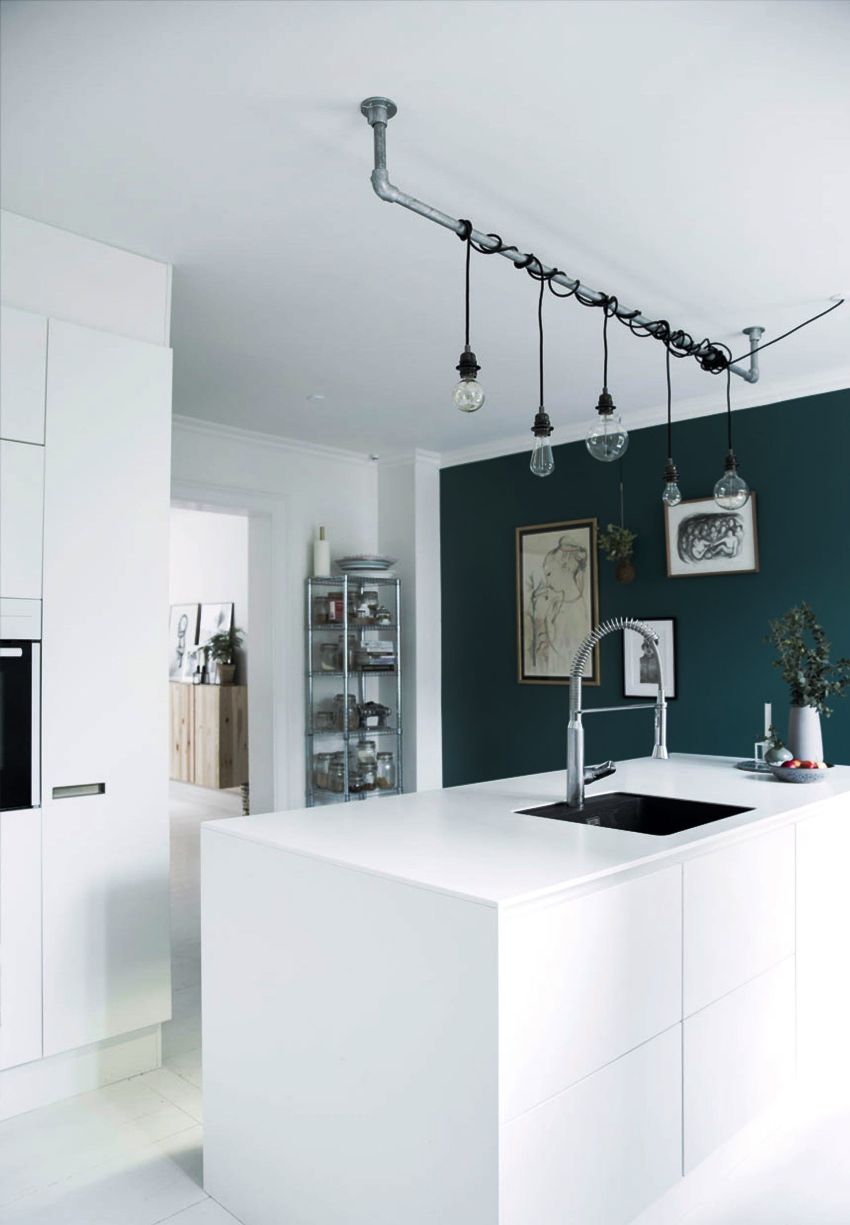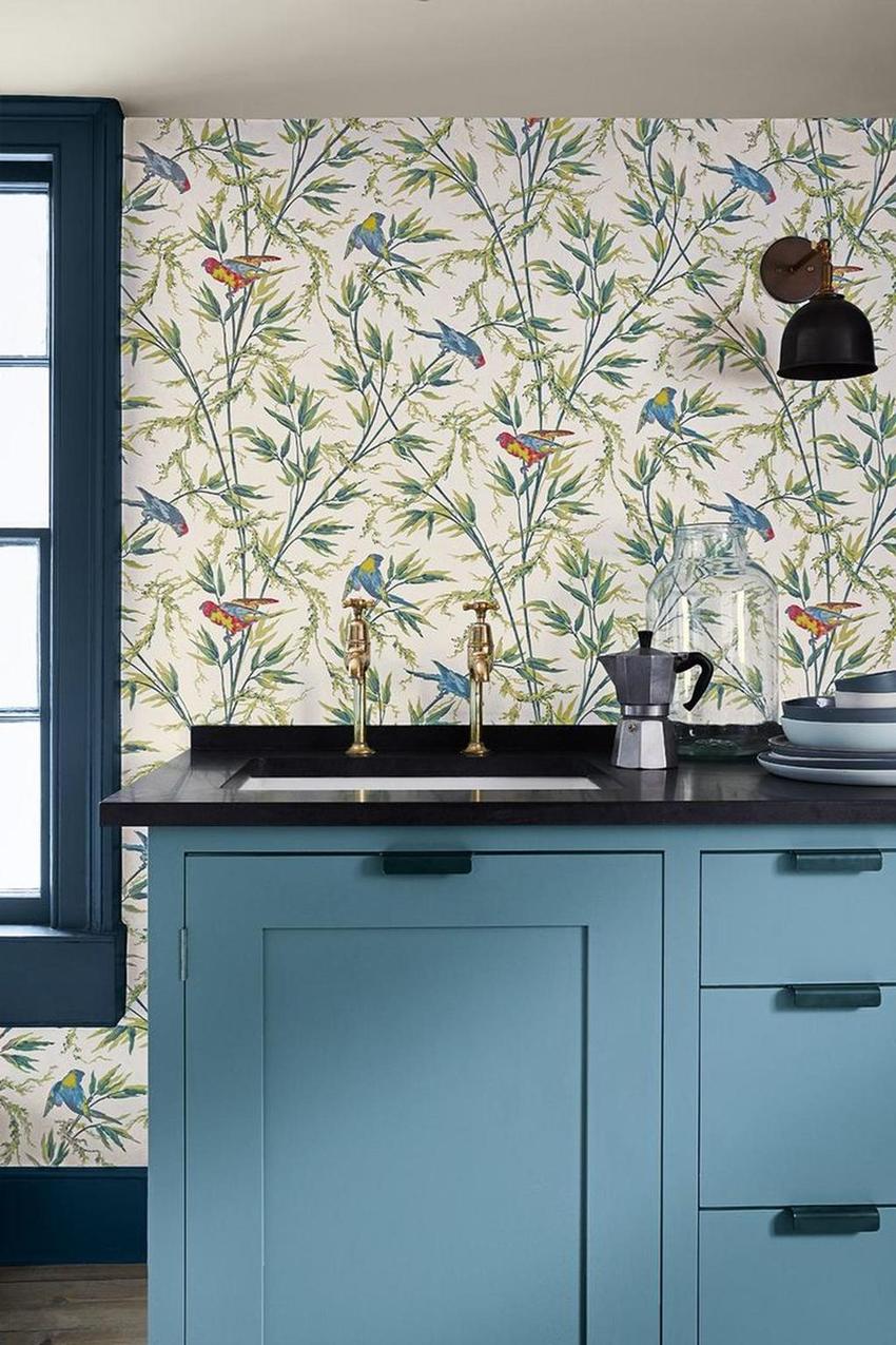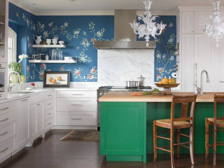 Niebieska tapeta do kuchni to jedna z najbardziej praktycznych opcji. Na tak ciemnej powierzchni tłuszcz i krople nie są widoczne. Niebieskie wykończenie najlepiej komponuje się z białą zabudową kuchenną, drewnianymi meblami i kamiennymi blatami.