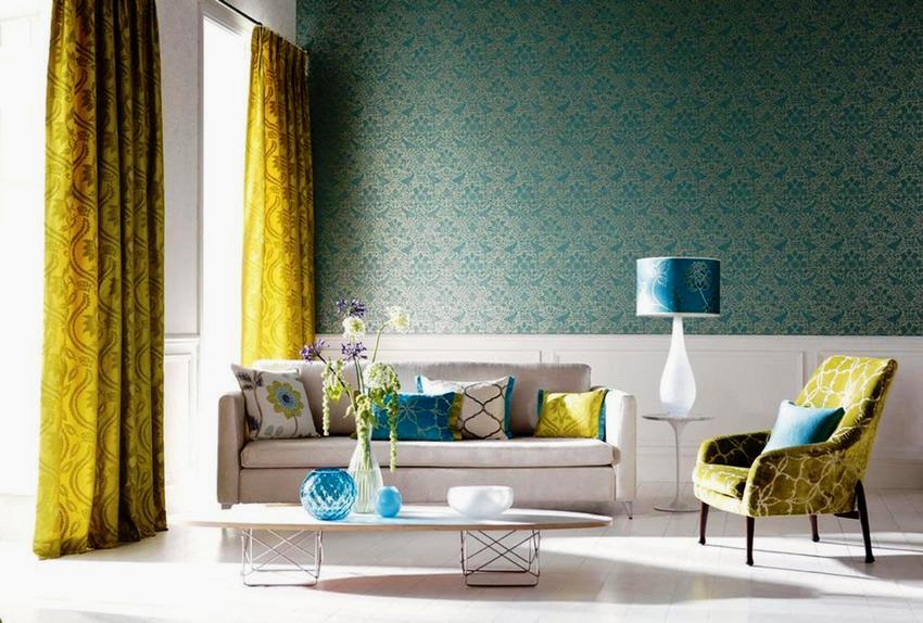 Tapeta w kolorze niebieskim w połączeniu ze srebrem wygląda jak królewski luksus. Dopełnieniem takiej powłoki powinny być wazy z kutego żelaza, srebrne świeczniki, narzuty i poduszki zdobione haftem ze srebrnych nici, które podkreślą świeżość i reprezentacyjność wnętrza. Połączenie niebieskiego i złotego wygląda oryginalnie i bogato. Taka dekoracja sprawia, że wystrój pomieszczenia jest surowy, ale wyrafinowany. Idealny do przestronnego i jasnego pomieszczenia. Ciekawy kontrast można uzyskać uzupełniając złoto zielonymi refleksami.