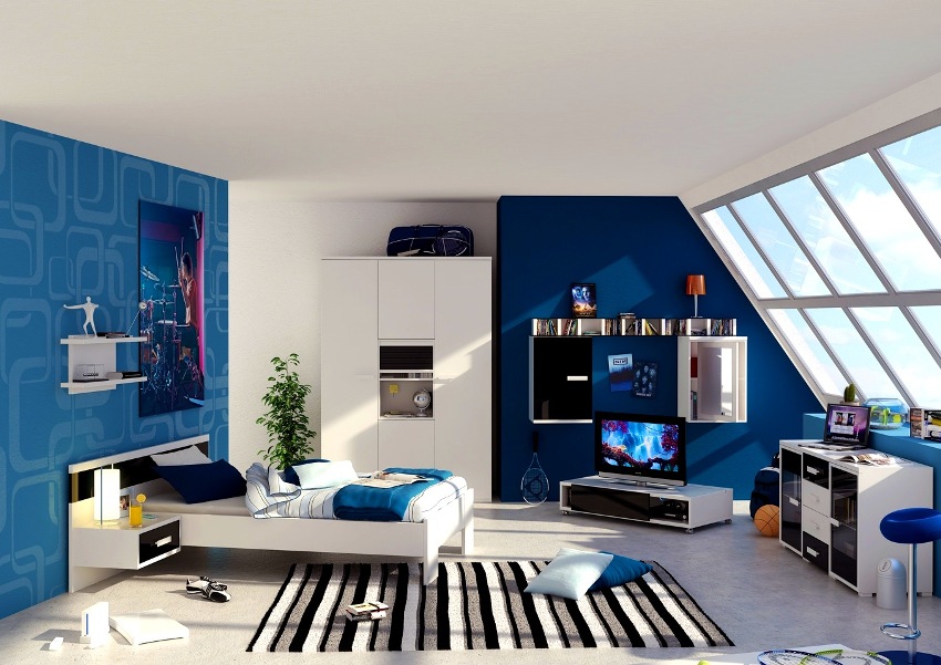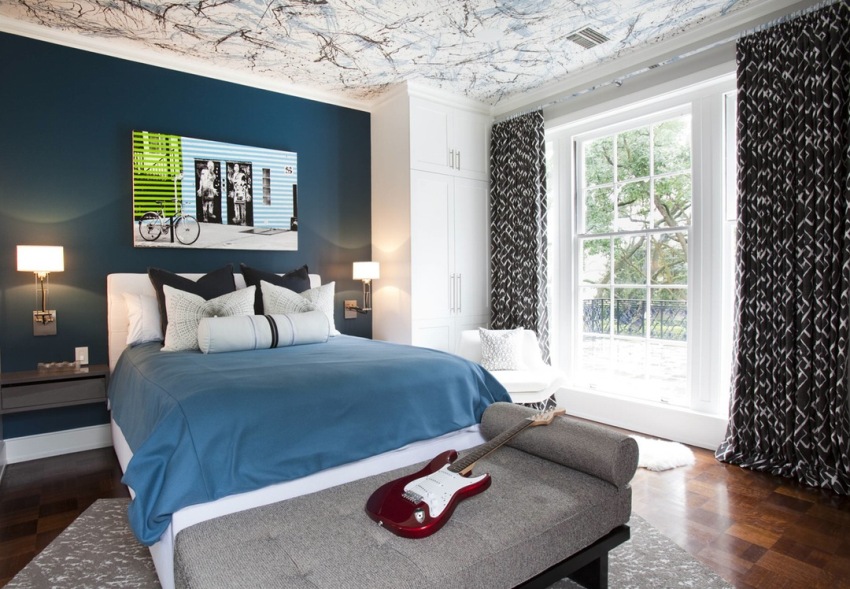 Klasyk to połączenie błękitu i bieli we wnętrzu. Zaglądając w taki tandem, od razu widać bezkresne niebo z unoszącymi się chmurami powietrza. Dopełnieniem tego połączenia będą białe meble, które sprawią, że projekt pomieszczenia będzie kompletny i kompletny. Pomieszczenie wygląda niecodziennie i tajemniczo, w którym do dekoracji ściany akcentującej użyto czarno-niebieskiej tapety. Aby pokój nie wyglądał ponuro, należy do niego dodać lekkie detale. Oszałamiający efekt uzyskuje się, dekorując pomieszczenie metodą gradientu, łącząc odcienie od jasnoniebieskiego do niebieskiego.