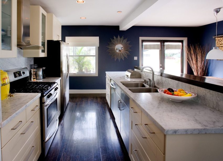 Dekoracja kuchni, korytarza, łazienki w kolorze niebieskim
