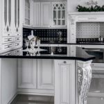 O desenho de uma cozinha clássica branca começa com uma área de trabalho que deve enfatizar séculos de tradição e valores familiares. Nessas salas, geralmente é possível encontrar fones de ouvido diretos com uma ilha, localizados ao lado da sala de jantar. A melhor opção é um magnífico conjunto de móveis no formato da letra P, onde há lugar para todas as pequenas coisas. Uma cozinha de canto branca é instalada apenas se as laterais do fone de ouvido forem simétricas e iguais em comprimento.