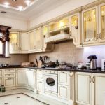 Conselho util! Os armários de cozinha em interiores clássicos devem atingir o teto, mesmo que as prateleiras superiores não sejam acessíveis. A parte superior das fachadas é decorada com cornijas de teto. Esta técnica dará uma aparência majestosa a toda a sala.