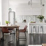 A combinação do brilho branco da cozinha com outros elementos de decoração