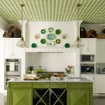 O papel de parede deve ser escolhido de forma que se misture harmoniosamente com o design. As paredes podem ser decoradas com tintas, gesso ou painéis de plástico. Devem ter um mínimo de desenhos - é melhor em algum lugar, por exemplo, em uma parede que seja acento. É permitido o uso de cores vivas na área do avental. O desenho dos tetos pode ser tradicional (usando gesso), e opções modernas também são utilizadas na forma de lonas elásticas ou painéis de plástico.