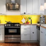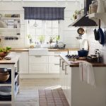 Acabamentos tradicionais combinados com móveis brilhantes são raros. Na maioria das vezes, aqui são usadas persianas em vez de cortinas, e ladrilhos de cerâmica são usados apenas no chão, com exceção da imitação de uma parede de tijolos em um avental com a ajuda de ladrilhos.