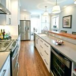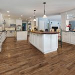 - um padrão de piso semelhante a um pódio ou ladrilhos de cerâmica ornamentais que criam o contorno de uma cozinha ou área funcional;