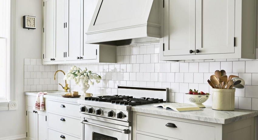 Para decorar um avental sobre a superfície de trabalho de uma cozinha branca, você pode usar ladrilhos de cerâmica em um tom contrastante