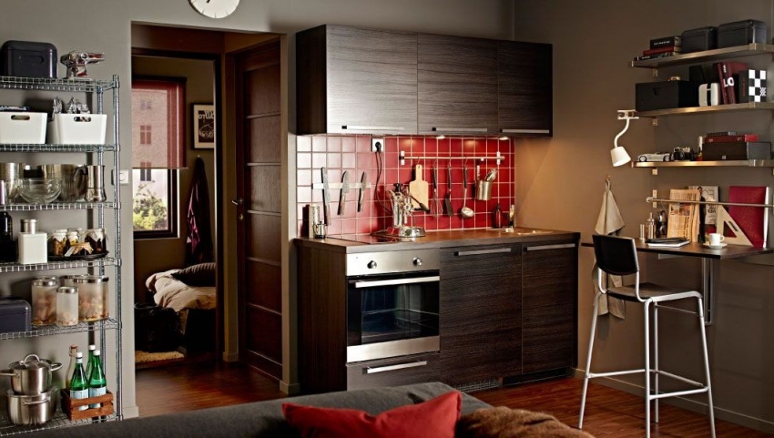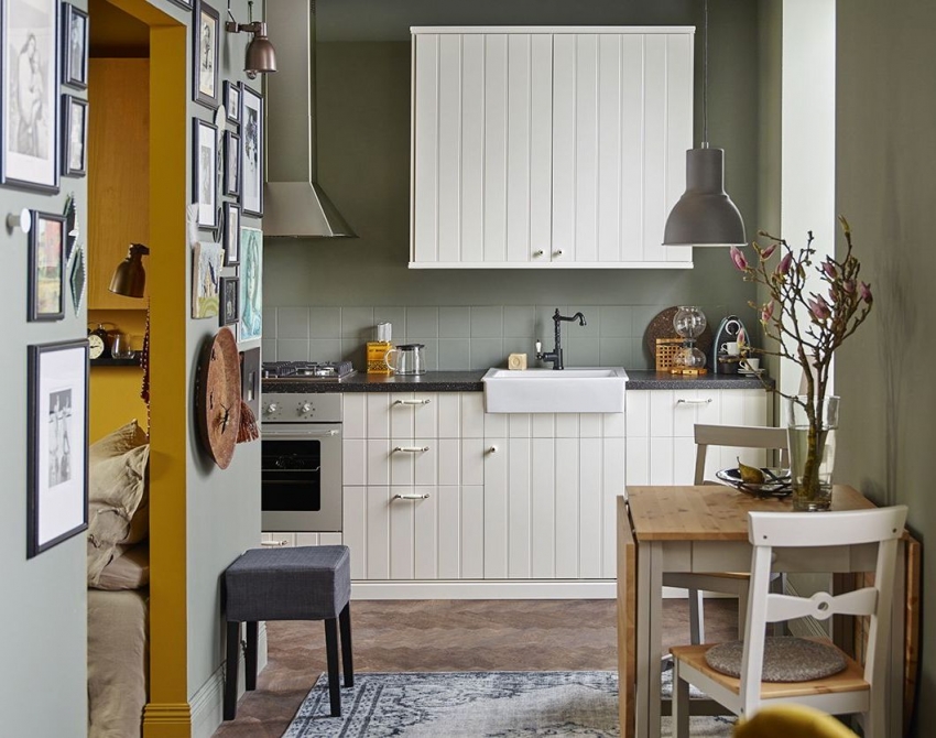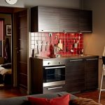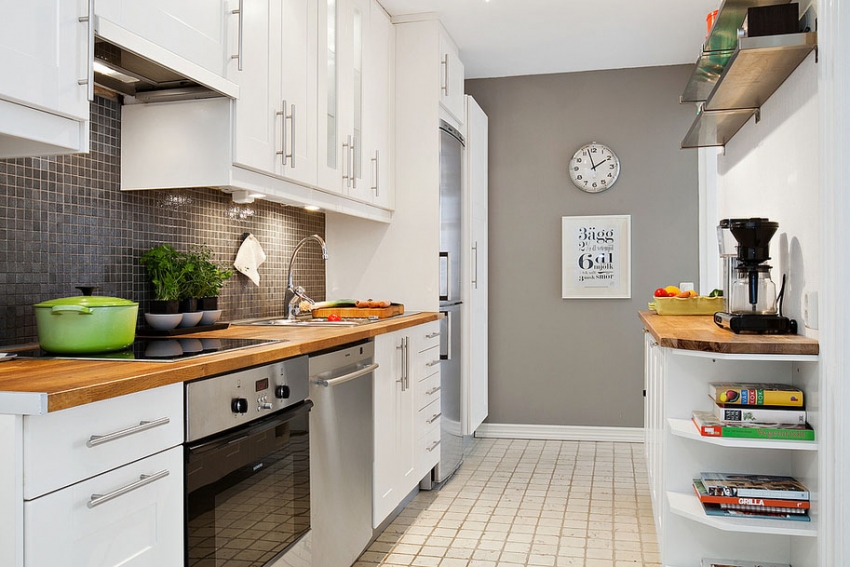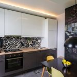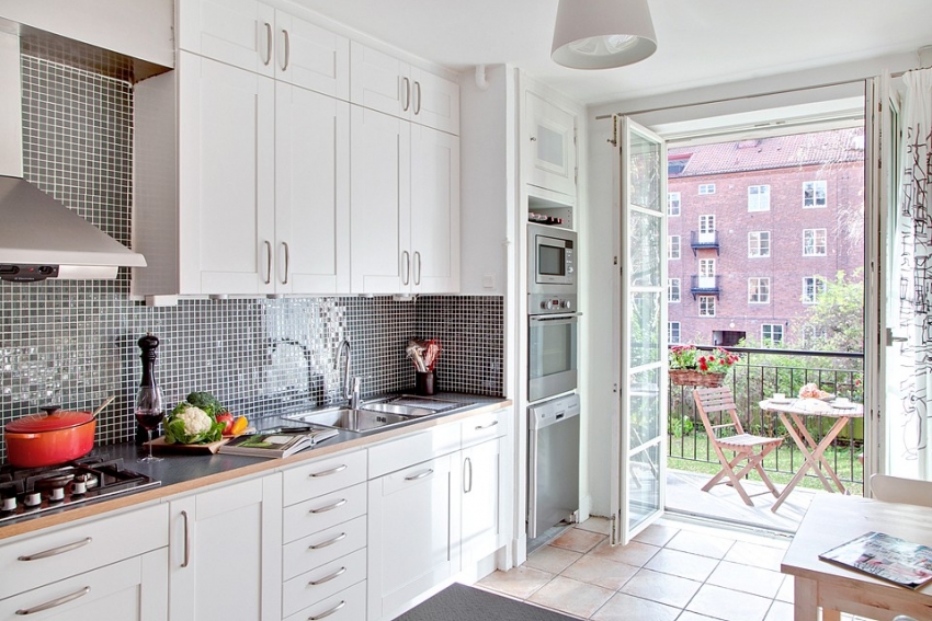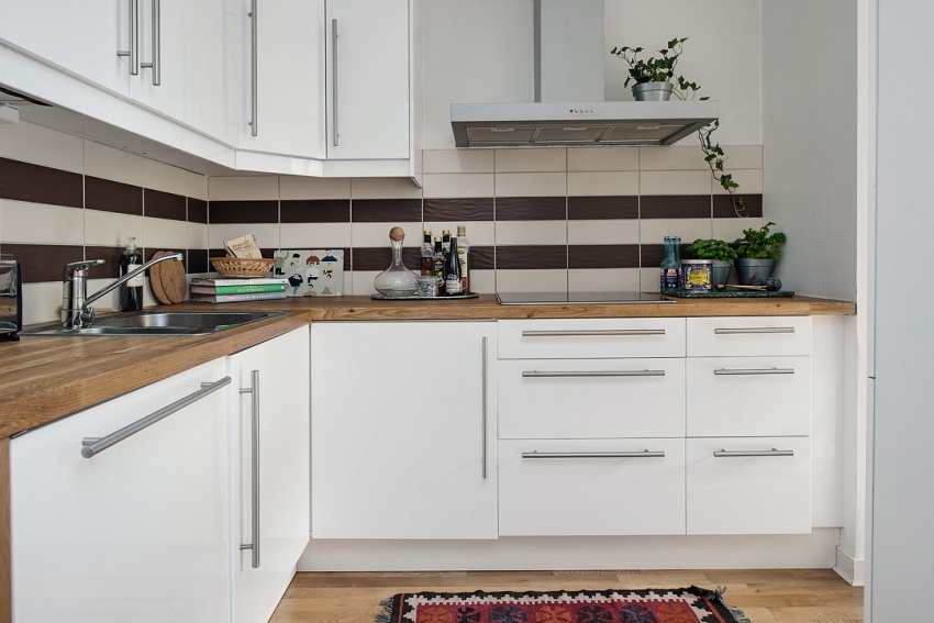 Se você precisar arrumar uma cozinha pequena, azulejos grandes parecerão inadequados.Apesar do fato de que o número de costuras em tal avental será menor, a superfície ficará visualmente desordenada, o que significa que toda a cozinha parecerá ainda menor.