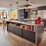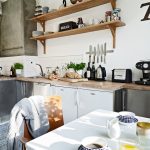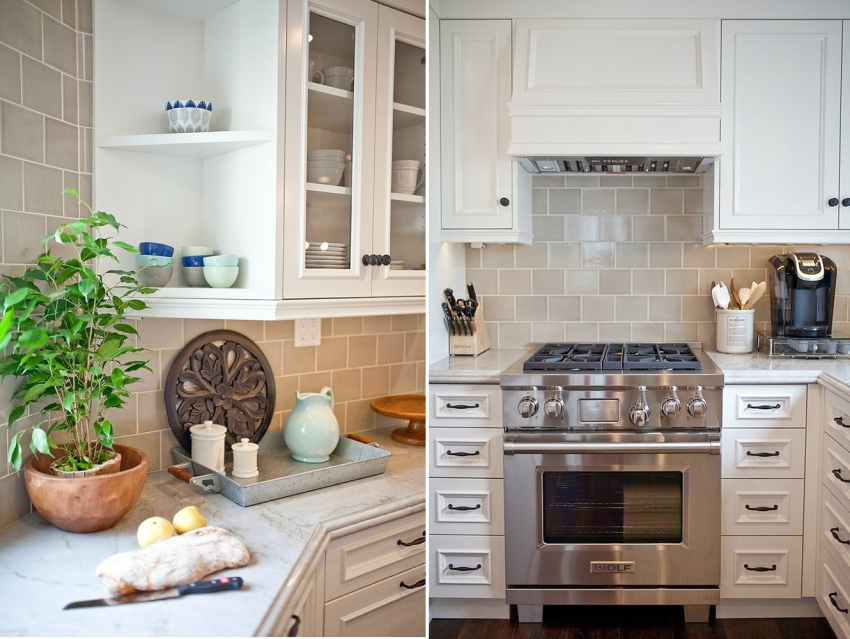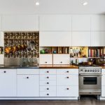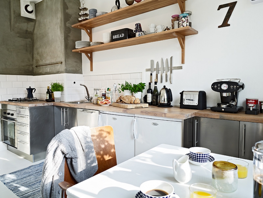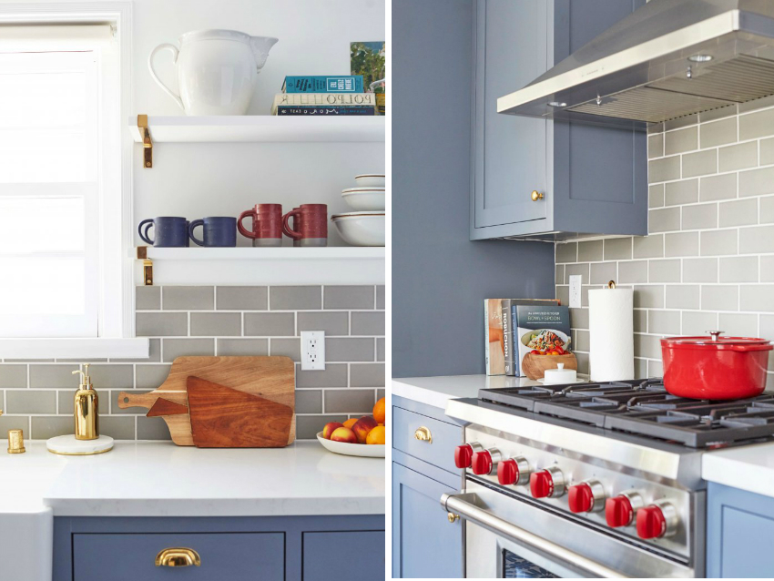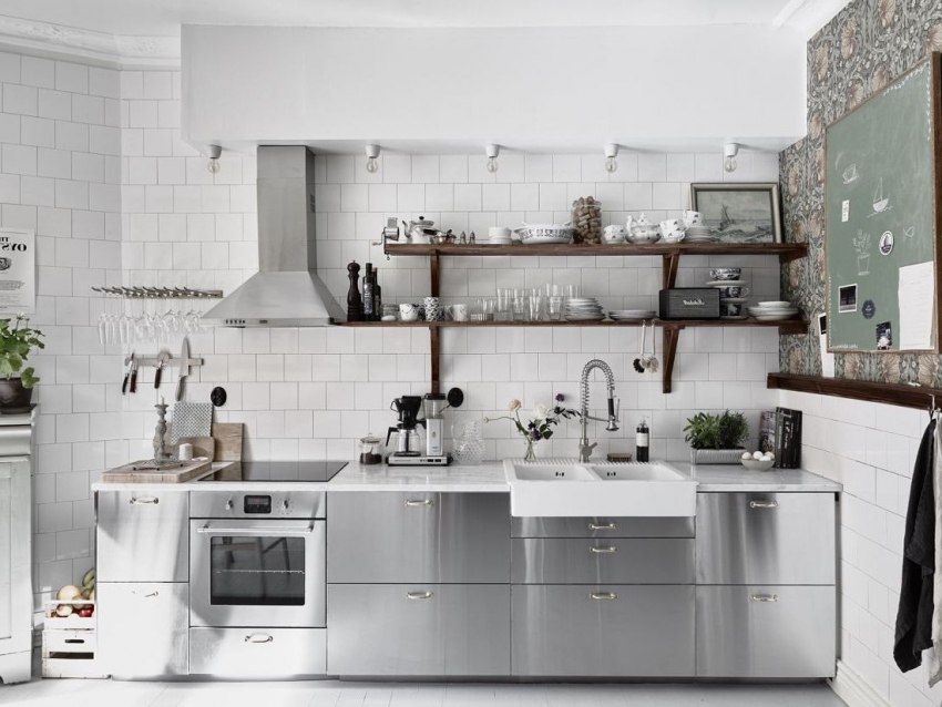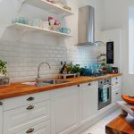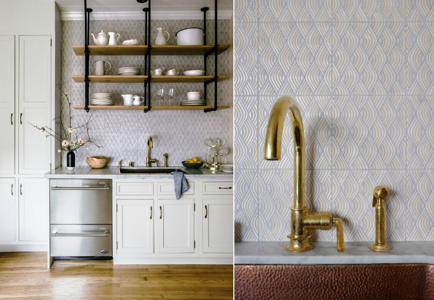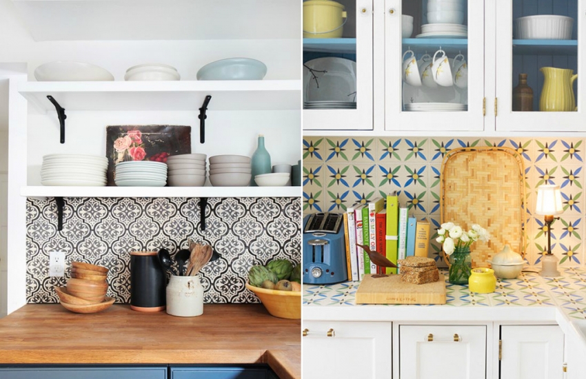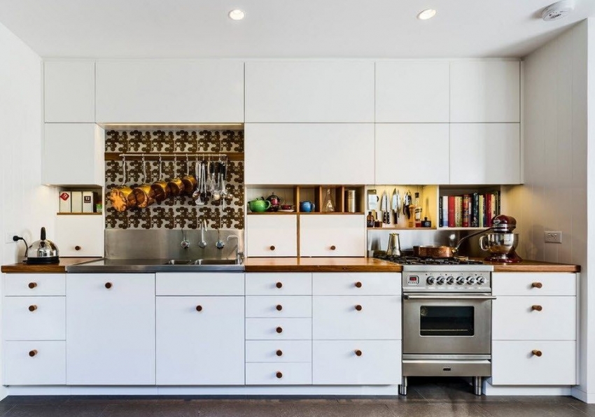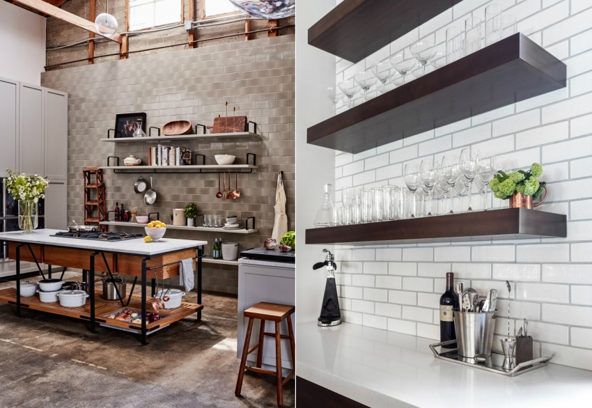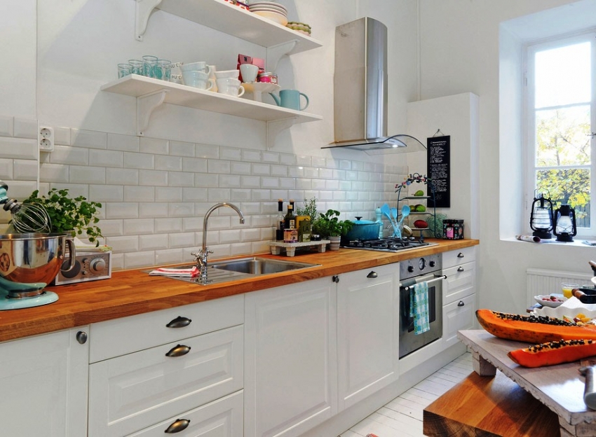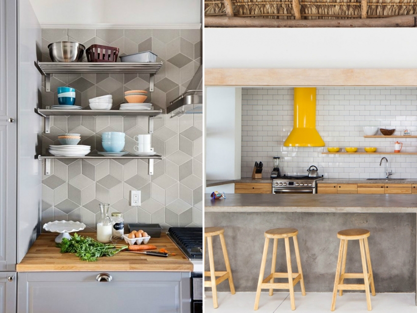 No registro cozinha de avental com prateleiras abertas, devem ser usados ladrilhos com um padrão ou forma interessante