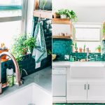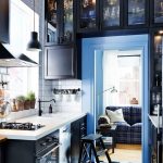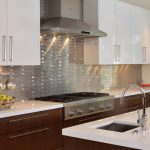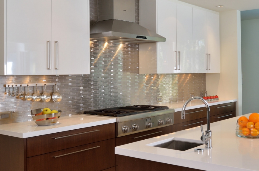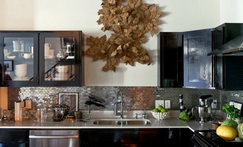 Usando telhas de espelho para um avental permite expandir visualmente o espaço da cozinha