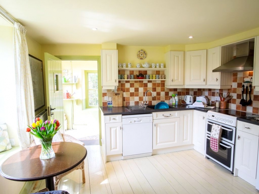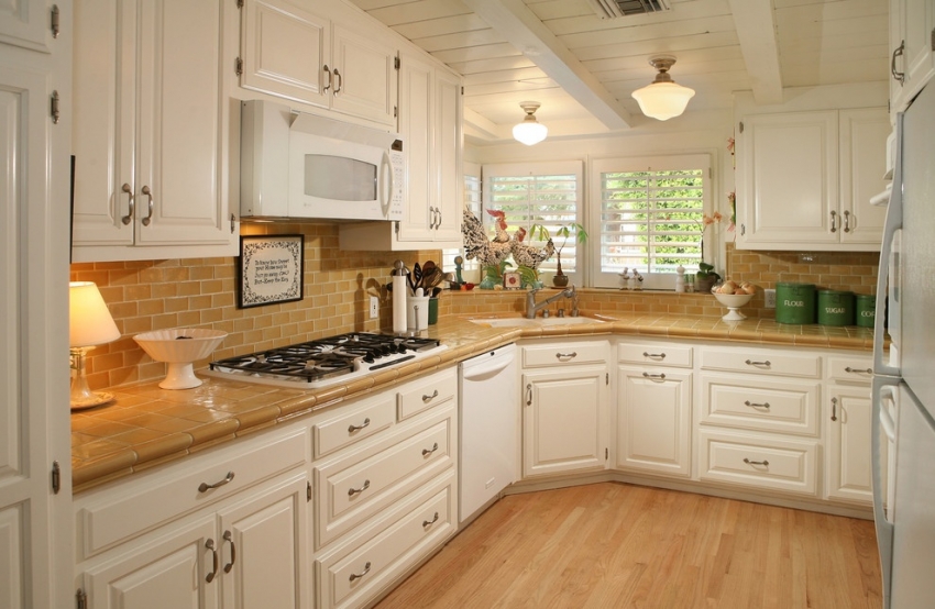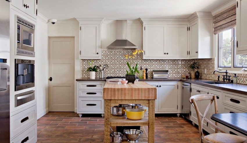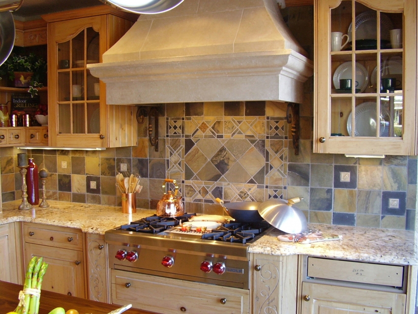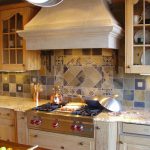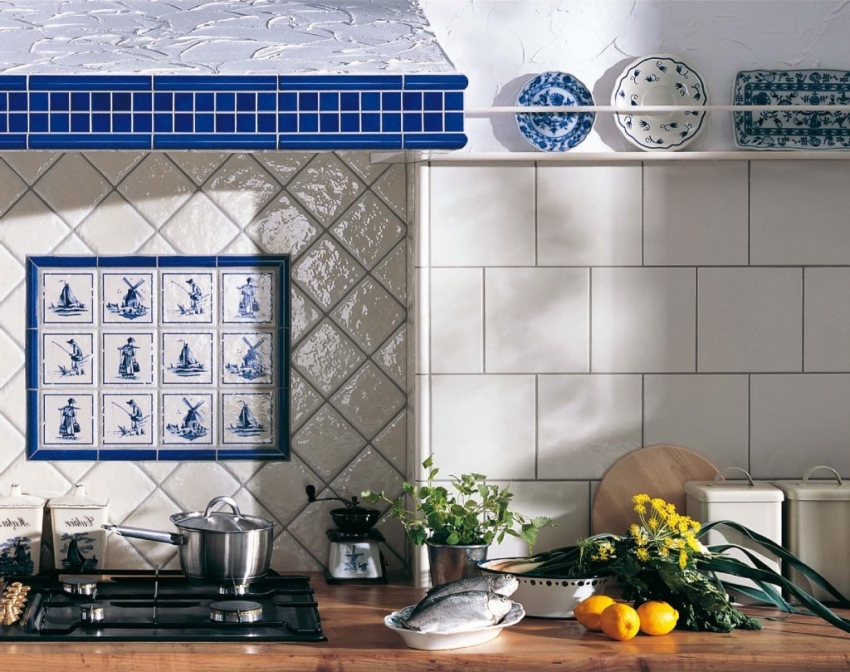 Painéis decorativos feitos de ladrilhos de cerâmica são frequentemente usados para decoração cozinhas estilo country