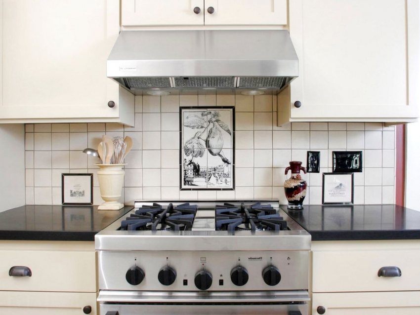 As principais regras para a colocação de tal painel são uma quantidade suficiente de espaço e simetria. A imagem ficará melhor na parte da parede onde o fogão está localizado, uma vez que normalmente é o centro do backsplash. Isso pode ser visto olhando para a foto dos ladrilhos no avental da cozinha em vários ambientes.