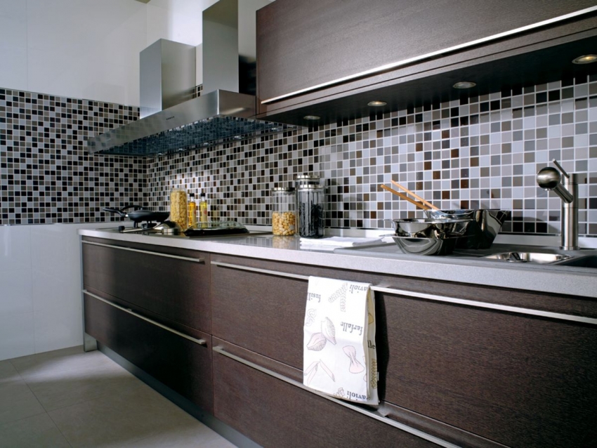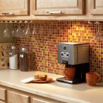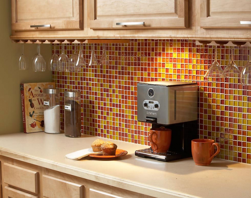 Uma boa ideia é usar um mosaico cujo tamanho dos elementos é 5x5 cm. Esses segmentos não serão muito pequenos, mas ao mesmo tempo darão um clima ao interior. Dá para comprovar na foto dos aventais de cozinha feitos de ladrilhos de cerâmica.
