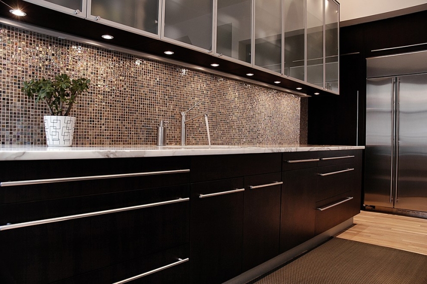 - é preferível utilizar ladrilhos com superfície brilhante, pois facilita a limpeza, pois será mais fácil remover a sujidade dos ladrilhos. Mas você deve saber que todos os vestígios de água e graxa são muito mais perceptíveis no brilho, por isso você terá que limpá-lo regularmente. Outro argumento a favor dos azulejos de avental brilhantes é a capacidade de refletir a luz, o que permite expandir visualmente o espaço. Naturalmente, um avental de espelho para a cozinha será o mais adequado para a expansão do espaço;