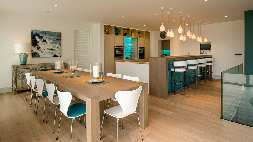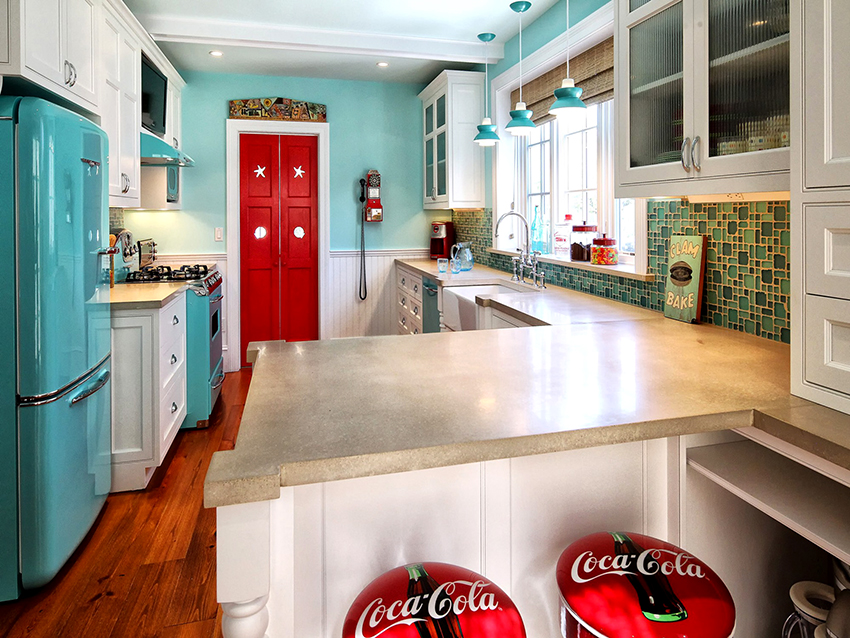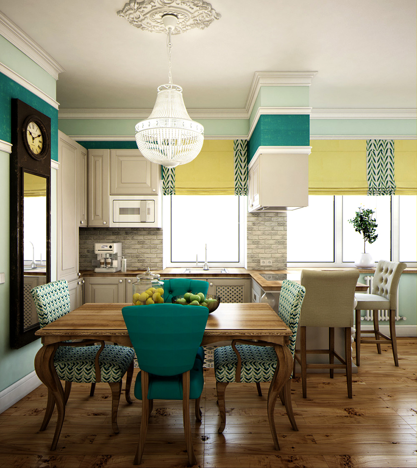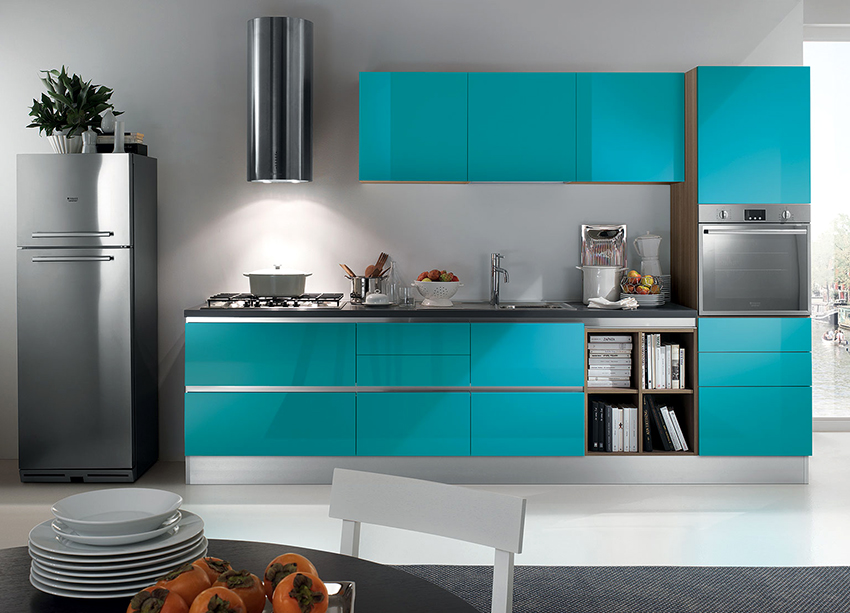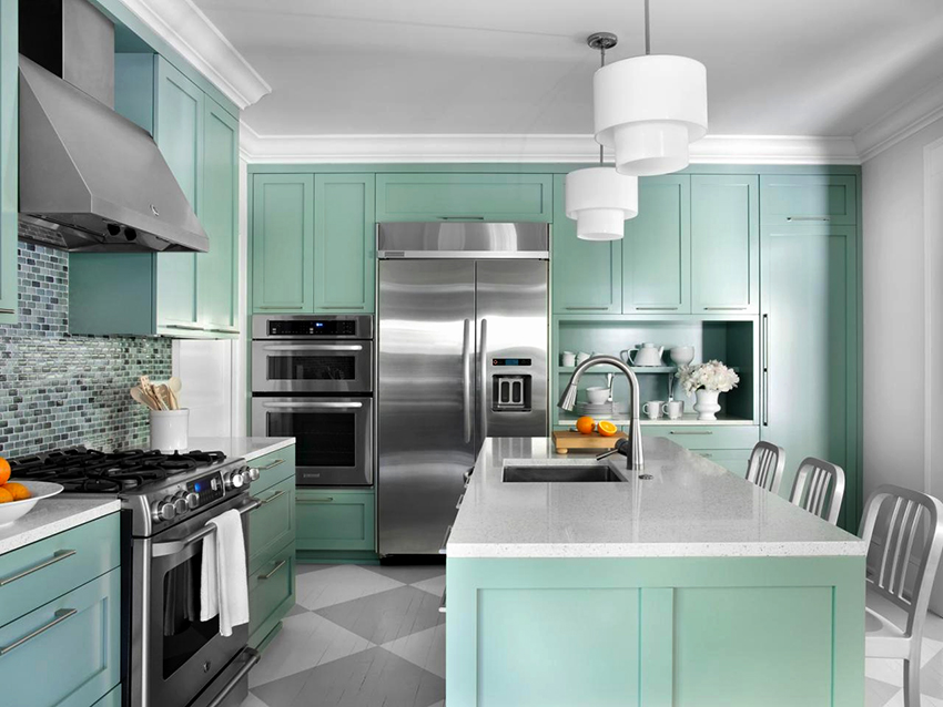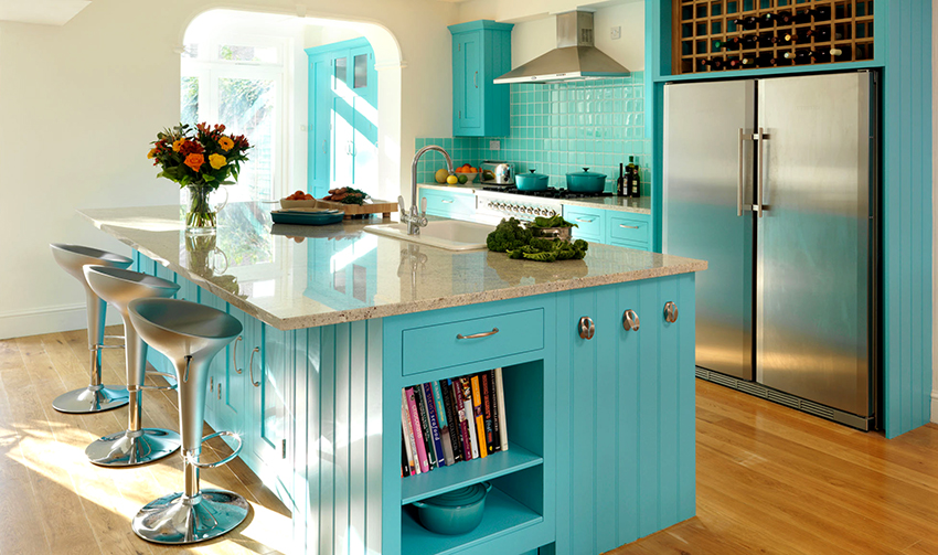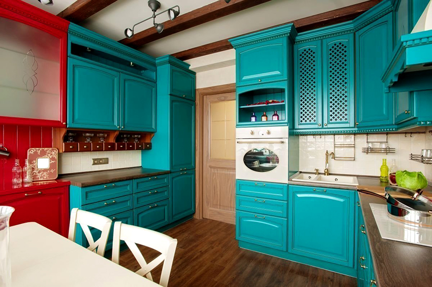 Se você olhar as fotos de cozinhas turquesa, poderá encontrar muitos tons aqui - do verde marinho profundo ao azul claro. Esses motivos marinhos são considerados relaxantes. Escolher tons de azul mais legais fará com que o ambiente pareça mais fresco, e escolher um tom turquesa mais intenso deixará a cozinha mais quente. A opção de design turquesa é mais frequentemente usada ao decorar cozinhas nos seguintes estilos: