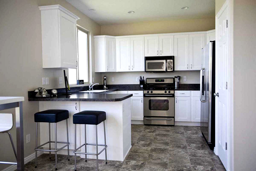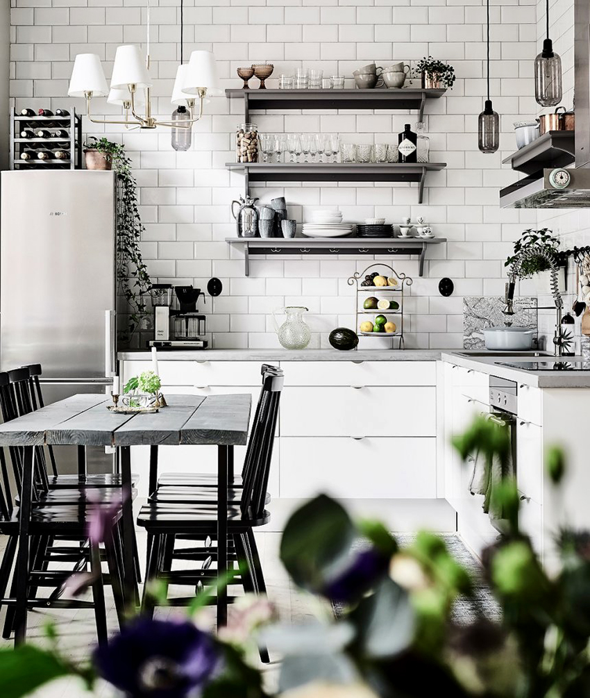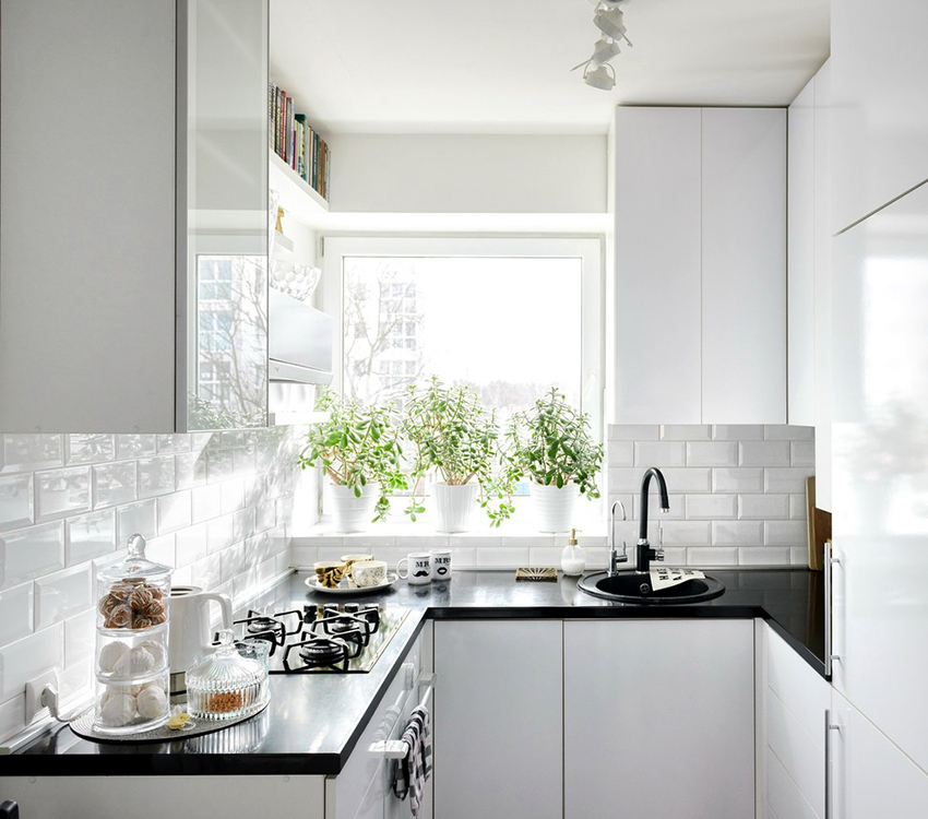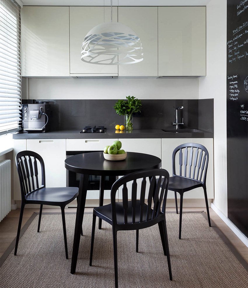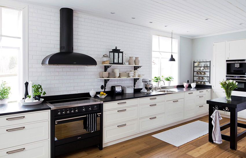 - Ladrilhos pretos e brancos quadrados colocados diagonalmente no chão irão expandir visualmente o volume da cozinha.