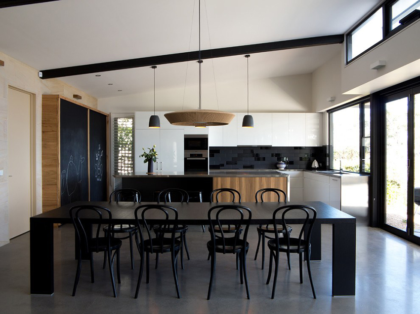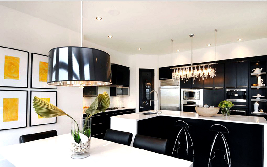 A combinação de preto e branco há muito se tornou tradicional, mas se você quiser fazer do preto a cor principal, o design dessa cozinha se torna muito mais complicado. Neste caso, existe o risco de criar um interior muito sombrio e escuro. Se você olhar as fotos de cozinhas, verá que as cores são mais frequentemente usadas em uma proporção de 60 a 40%, e a maioria delas recebe uma tonalidade branca.